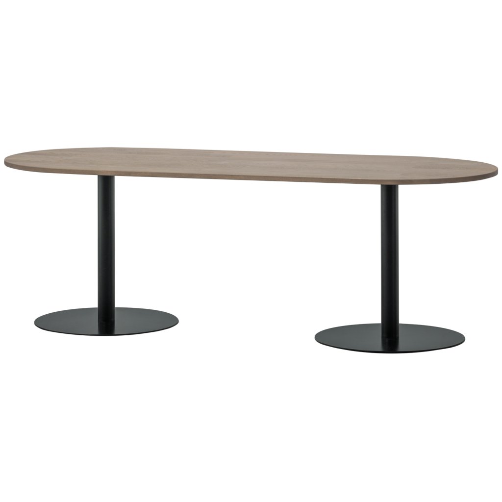 - Round leg with oak table top (FSC mix certified) -Create your ideal dining area -Oval table top with unique edge finishing -H 75 cm X W 219 cm x D 89 cm Create your ideal dining area with the versatile Tablo series by Dutch interior design brand WOOOD. With countless combination options and different sizes, you'll effortlessly put together the dining area that perfectly suits your needs. For example, choose this stylish oval dining table with an elegant, sleek look. The table top has a subtle, rounded edge finish, creating a refined and elegant look. The table top is treated with a water-based, gray stain, giving the wood a beautiful color. Together with the round metal leg, it forms the perfect combination! Features The table top is made of strips of glued oak with a finger joint which creates a playful motif. Oak is characterized by its clearly visible grain pattern. The natural imperfections of the oak make each table unique. The tabletops are lightly sanded which accentuates the grain marks and makes the stain and lacquer colors stand out even more. The oak wood in our collections is FSC mix certified. The round leg is made of metal, finished with a black powder coating. Dimensions -Height: 75 cm. -Width: 219 cm. -Depth: 89 cm - Total weight: 83 kg - Maximum weight: 70 kg Maintenance Treated oak is very easy to maintain. Keep the furniture dust-free regularly with a clean, dry cloth. Remove damp stains immediately with a slightly damp cloth and neutral detergent, allow the wood to air dry. Always observe the basic protection for wood, such as using a trivet under a drinking glass or hot pan. In case of damage, consult a specialized paint store for possible furniture re-treatment. All our collection metals have been thoroughly treated and therefore do not require re-treatment. Should the metal be damaged, consult a specialized paint store. Treated metal is easy to keep clean with a slightly damp cloth and a mild detergent, drying the surface afterwards ensures a streak-free result. Delivery The table top and table leg are delivered in two separate packages. The table leg can be assembled using the supplied assembly instruction.Doplňkové parametry