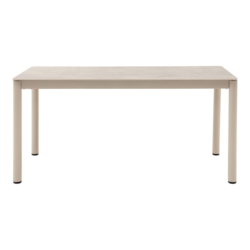 Designový zahradní stůl ALCUDIA od dánské značky nádherného skandinávského nábytku HOUSE NORDIC. ALCUDIA je velmi krásný a stylový zahradní jídelní stůl s 4 kulatými nohami z lehkého, ale odolného hliníku. Vrchní jídelní deska s rozměry 160x90 cm je dodávána v kuse a to z pevné a tvrzené keramiky v decentní béžové barvě, která připomíná přírodní kámen. Díky tomu je stůl velmi odolný a téměř bezúdržbový.