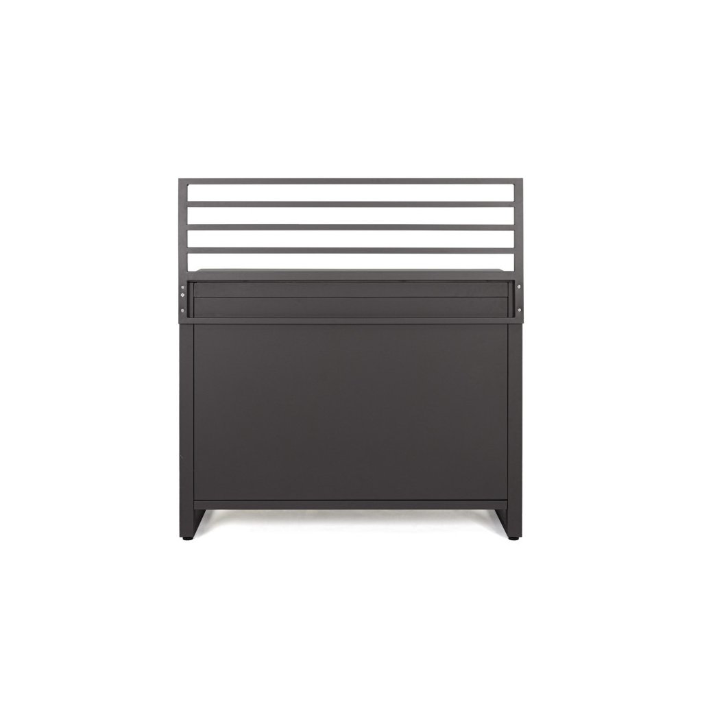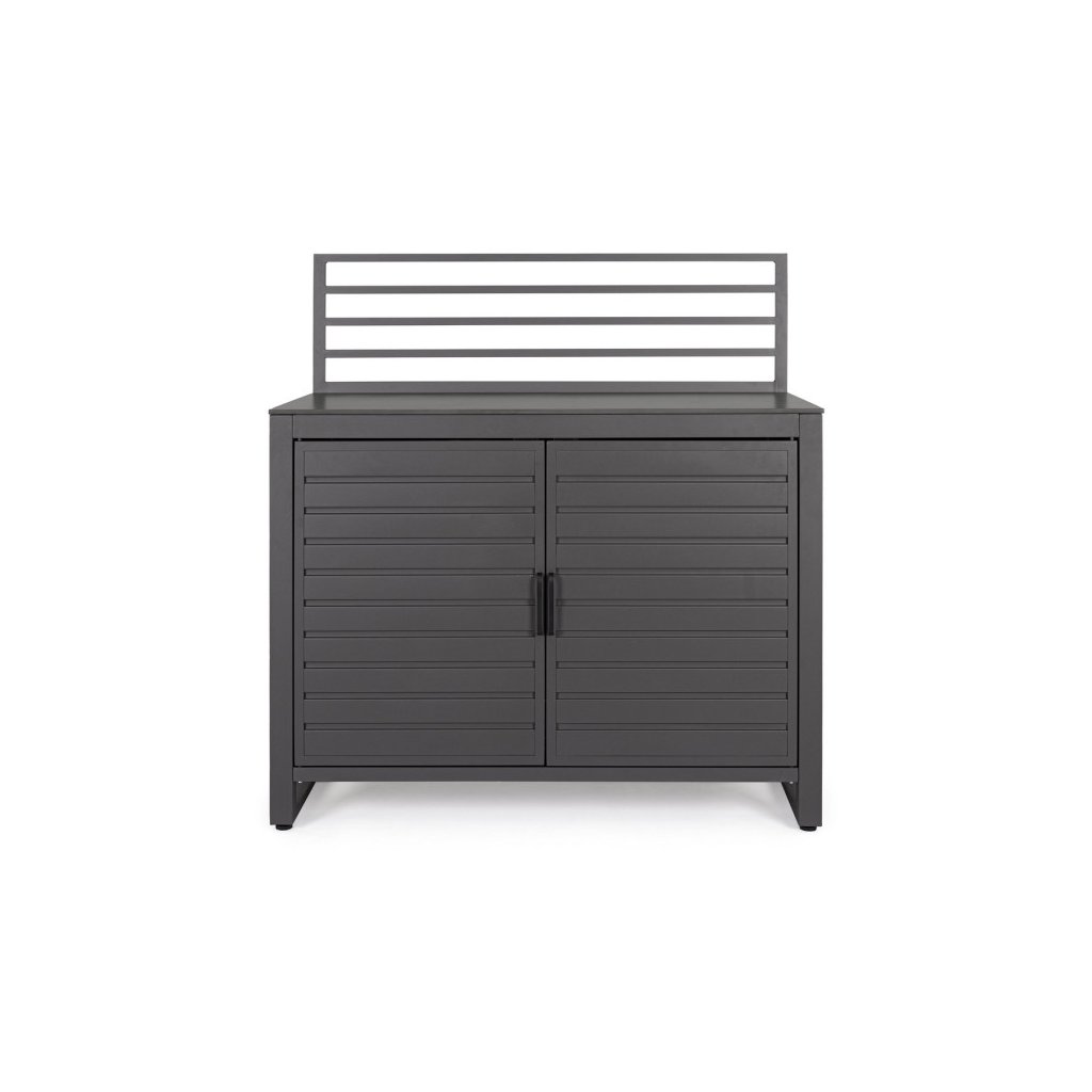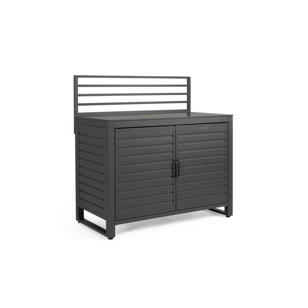 Modul zahradní linky ANIA od italského výrobce stylového nábytku BIZZOTTO v antracitovým provedení. Tento modul zahradní kuchyňské linky je vyroben z hliníku, má 2 dvířka, za kterými najdete 2 a 1 poličku. Nahoře jako pracovní deska slouží tvrzený kámen v provedení břidlice. Složte s dalšími 2 kusy a máte parádní zahradní kuchyňku. K dostání i v dalších barevných variantách.