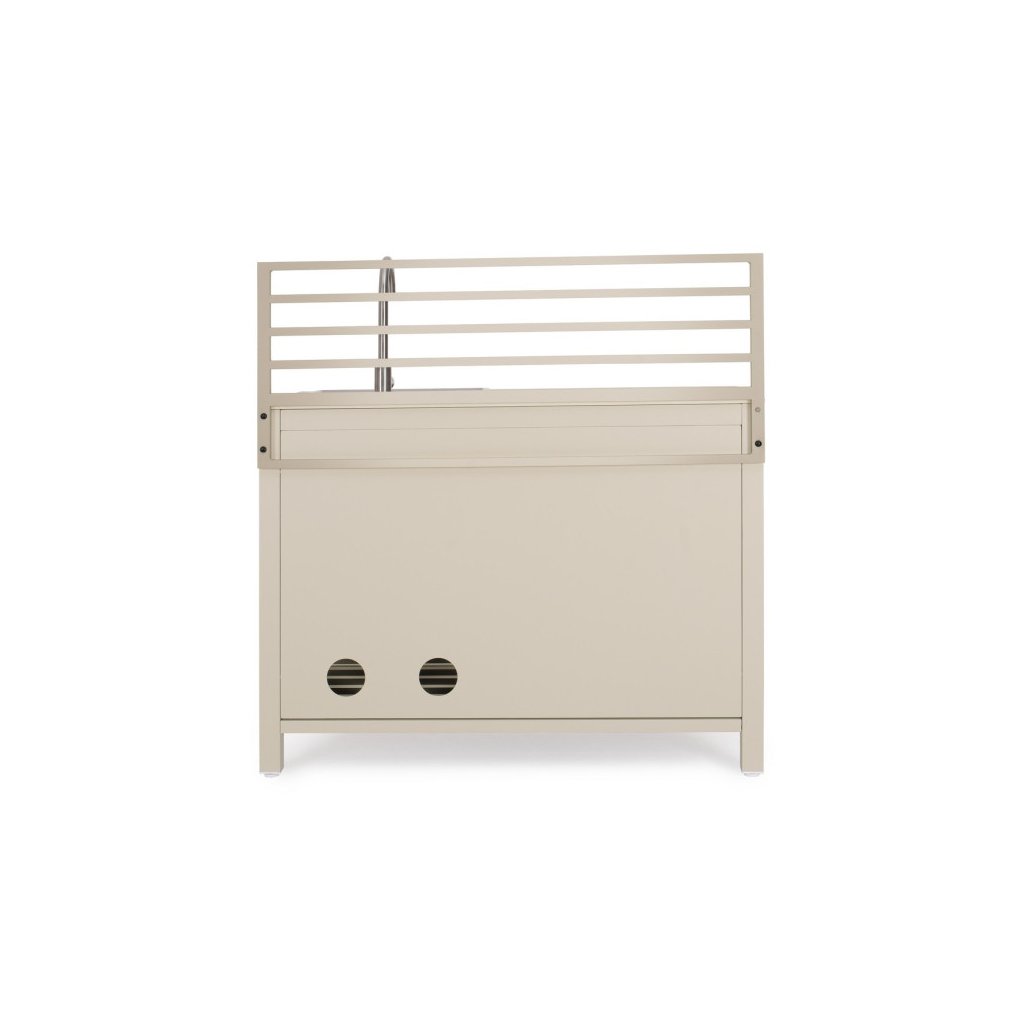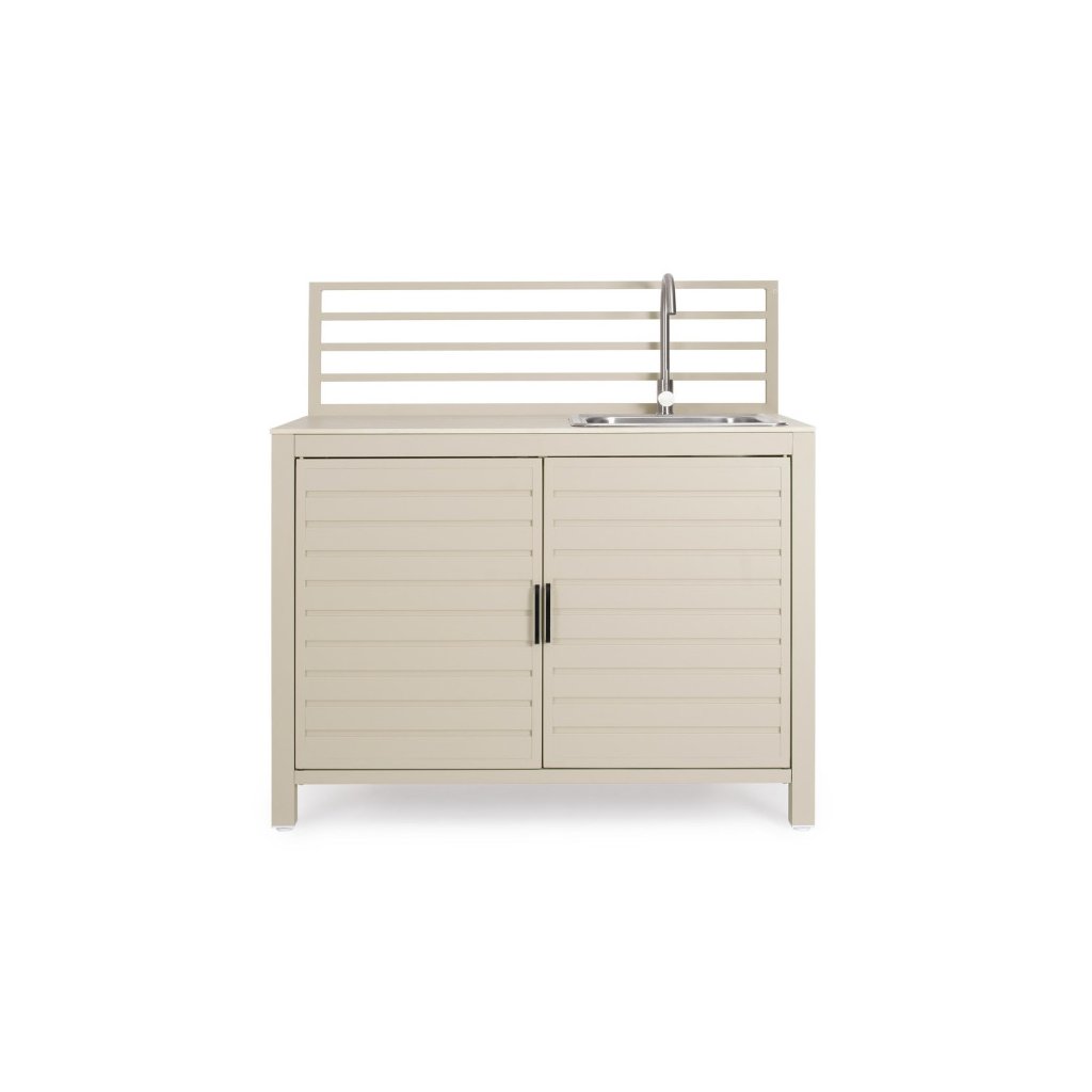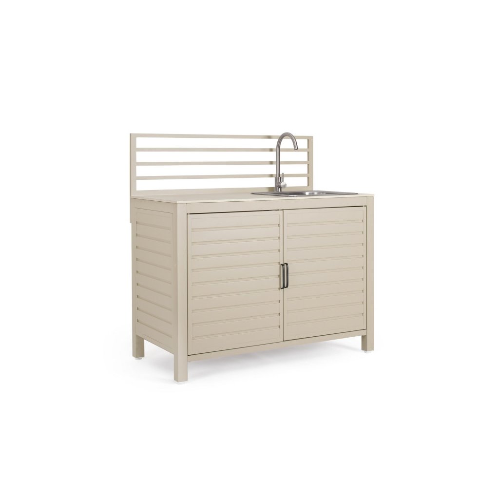 Modul zahradní linky ARIA od italského výrobce stylového nábytku BIZZOTTO v béžovém provedení. Tento modul zahradní kuchyňské linky je vyroben z hliníku, má 2 dvířka, za kterými najdete 2 a 1 poličku. Nahoře jako pracovní deska slouží tvrzený kámen v provedení travertin a nerezový dřez s baterií. Složte s dalšími 2 kusy a máte parádní zahradní kuchyňku. K dostání i v dalších barevných variantách.