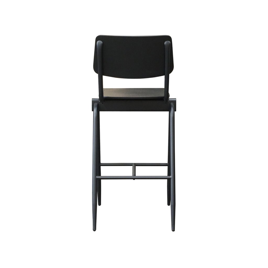 Stylová barová židle SOLID od holandského výrobce nábytku LABEL51. Židle SOLID je tvořena kombinací pevného kovového rámu a dřevěného sedáku i opěráku v černé barvě, díky čemuž je židle extrémně odolná a pevná. Hodí se do moderních, industriálních či skandinávských interiérů, ale díky robustní konstrukci klidně i do kaváren, barů či pracoven.