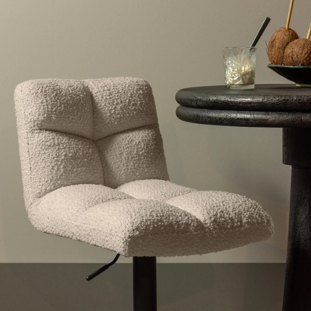 Designová barová židle VINNY od holandského výrobce kvalitního designového nábytku WOOOD. Židle je dodávána s centrální otočnou nohou z černě lakovaného kovu, výplní z polyuretanové pěny a povlakem z měkké buklé tkaniny v pískovém odstínu. Díky své otočné vlastnosti můžete krásně komunikovat se všemi v celé místnosti, aniž byste museli ze židle vstávat. Barová židle je praktická i díky nastavitelné výšce.