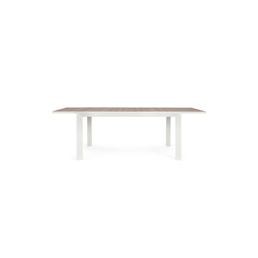 Stylový rozkládací zahradní stůl BELMAR od italského výrobce stylového nábytku BIZZOTTO. Stůl má 4 masivní nohy, které jsou vyrobeny ze světle šedě lakovaného hliníku, což dodává stolu stabilitu, odolnost proti povětrnostním podmínkám a nízkou váhu. Vrchní deska má primární rozměry 160x100 cm, díky vnitřním dílu ji rozložíte na délku 240 cm. Deska je vyrobena z lišt s dřevěným efektem lakování. Díky tomu stůl můžete nechat téměř bez jakékoliv péče a obavy.