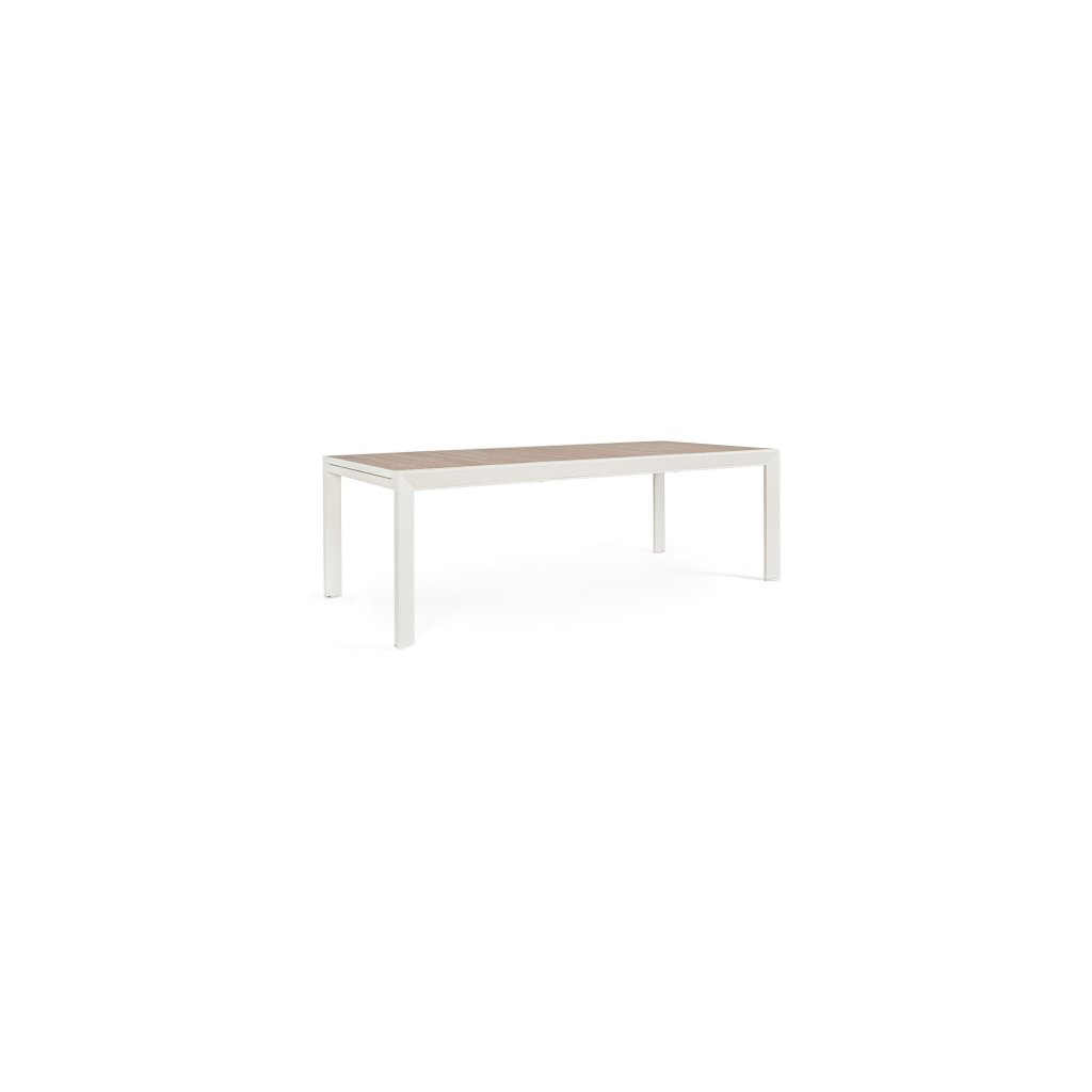 Stylový rozkládací zahradní stůl BELMAR od italského výrobce stylového nábytku BIZZOTTO. Stůl má 4 masivní nohy, které jsou vyrobeny ze světle šedě lakovaného hliníku, což dodává stolu stabilitu, odolnost proti povětrnostním podmínkám a nízkou váhu. Vrchní deska má primární rozměry 220x100 cm, díky vnitřním dílu ji rozložíte na délku 340 cm. Deska je vyrobena z lišt s dřevěným efektem lakování. Díky tomu stůl můžete nechat téměř bez jakékoliv péče a obavy.