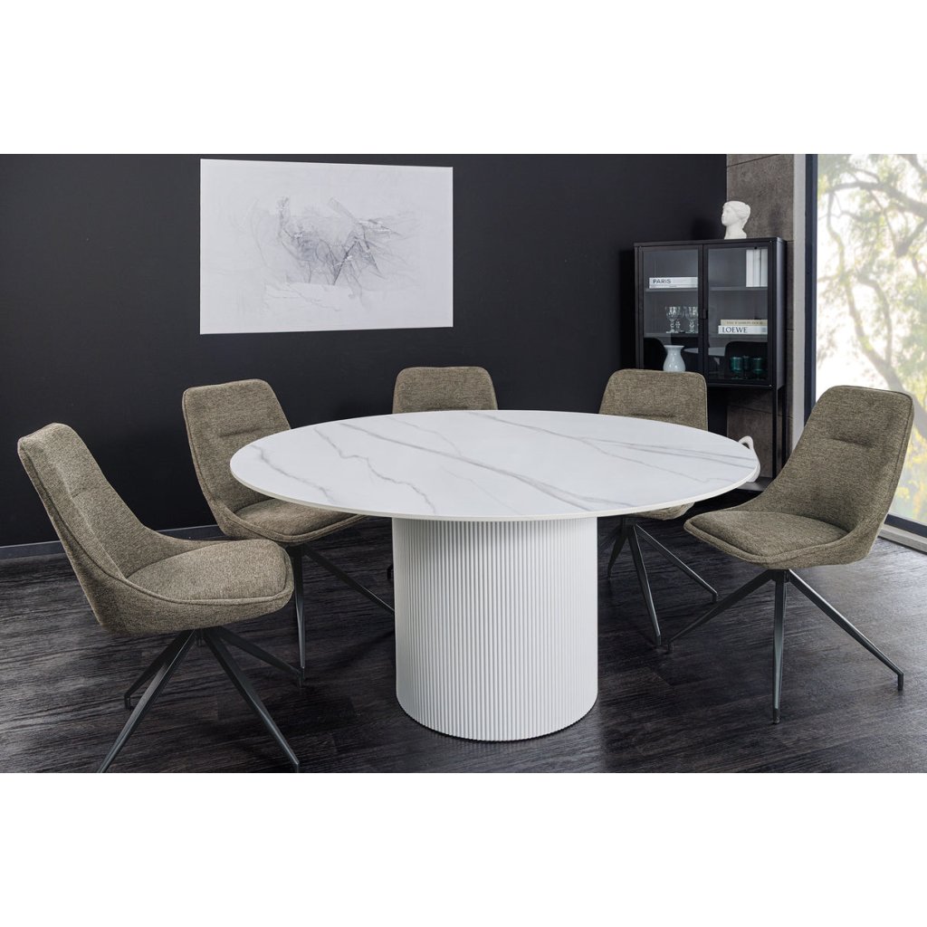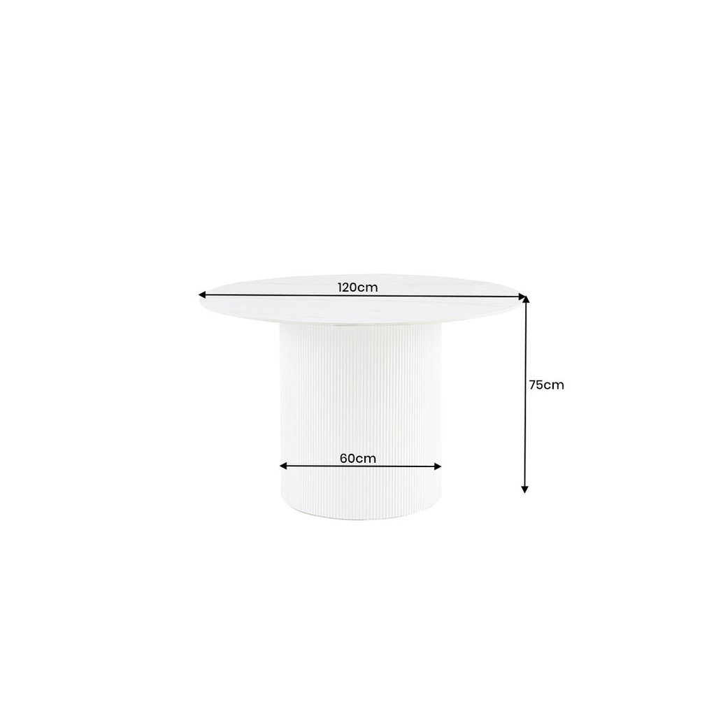 Designový kulatý jídelní stůl UNIQUE od německé značky krásného nábytku INVICTA. Kulatý stůl s keramickou deskou je elegantním a funkčním doplňkem moderního interiéru. Základna stolu je vyrobena z kombinace MDF bílé barvy a keramické desky v provedení bílého mramoru. Kulatá dřevěná noha zajišťuje stabilitu a podtrhuje nadčasový design. Díky praktickému kulatému tvaru o průměru 120 cm je stolek ideální vaší jídelny či kuchyně.