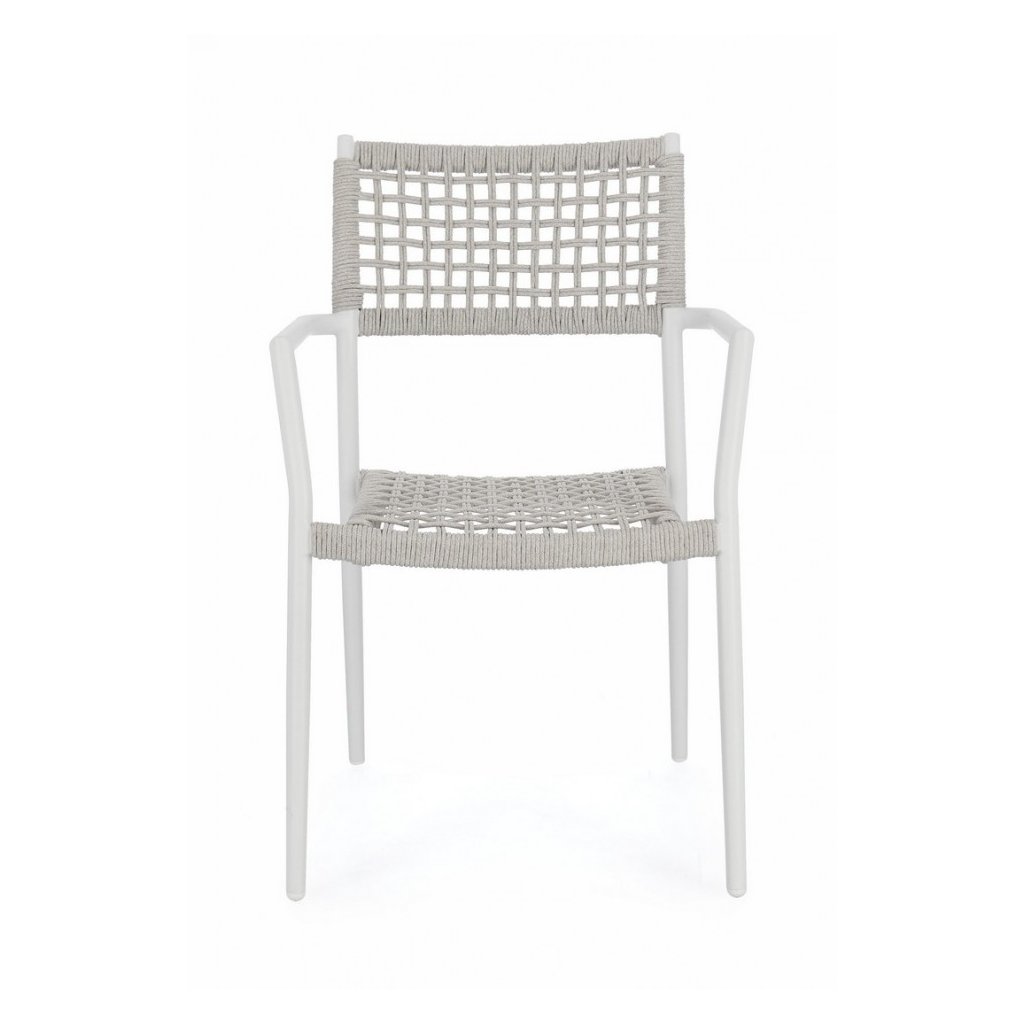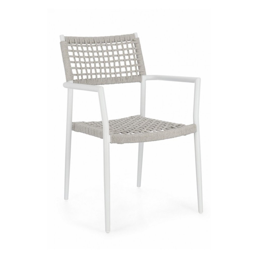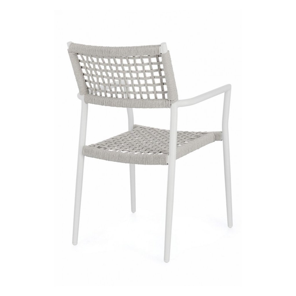 Designová zahradní židle CALETA od italského výrobce stylového nábytku BIZZOTTO.  Židle CALETA je dodávána s konstrukcí z práškovaného hliníku v bílé barvě.  Sedák a zadní opěrka je tvořena hlavně výpletem ze syntetického vlákna ve světle šedé barvě. Pro větší komfort oceníte i kovové područky. Díky odolnému materiálu je možné využít jak uvnitř, tak i venku. Židle je stohovatelná, dá se krásně uklidit na zimu.