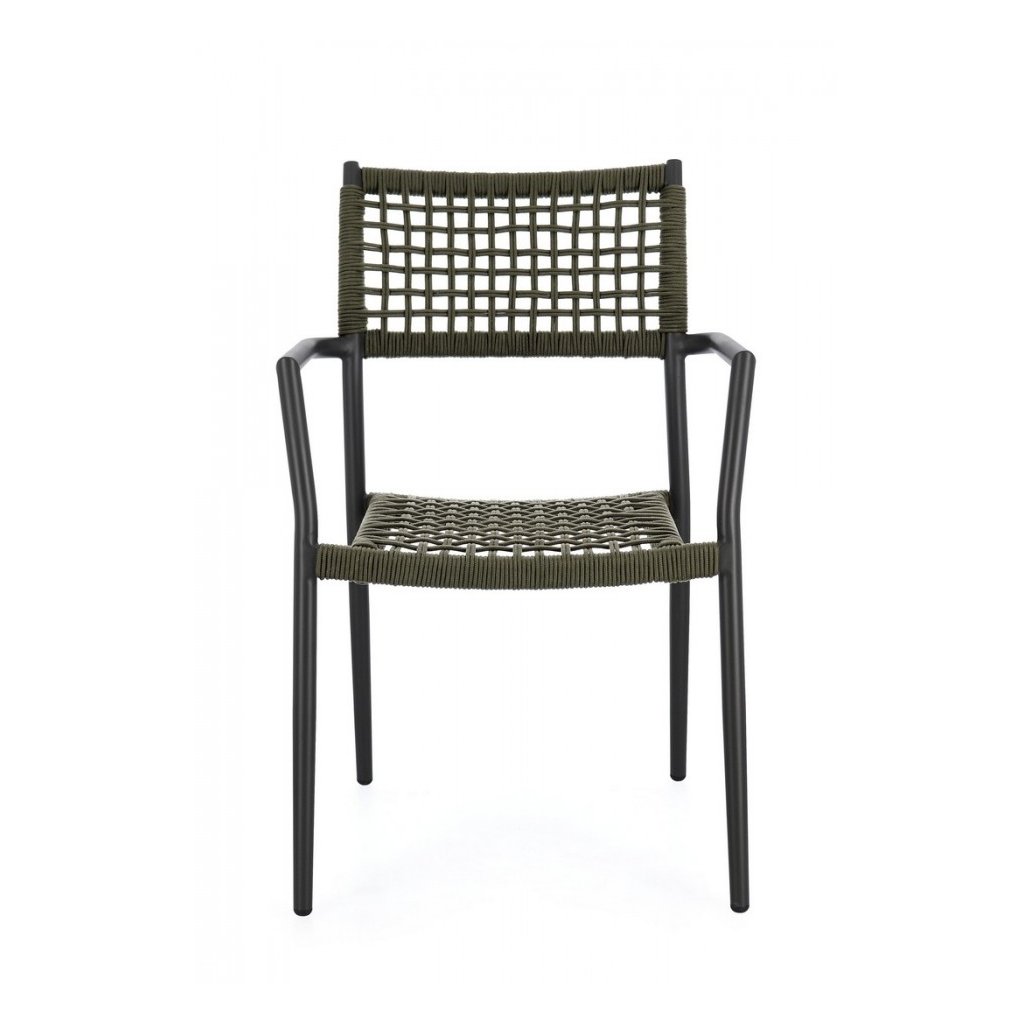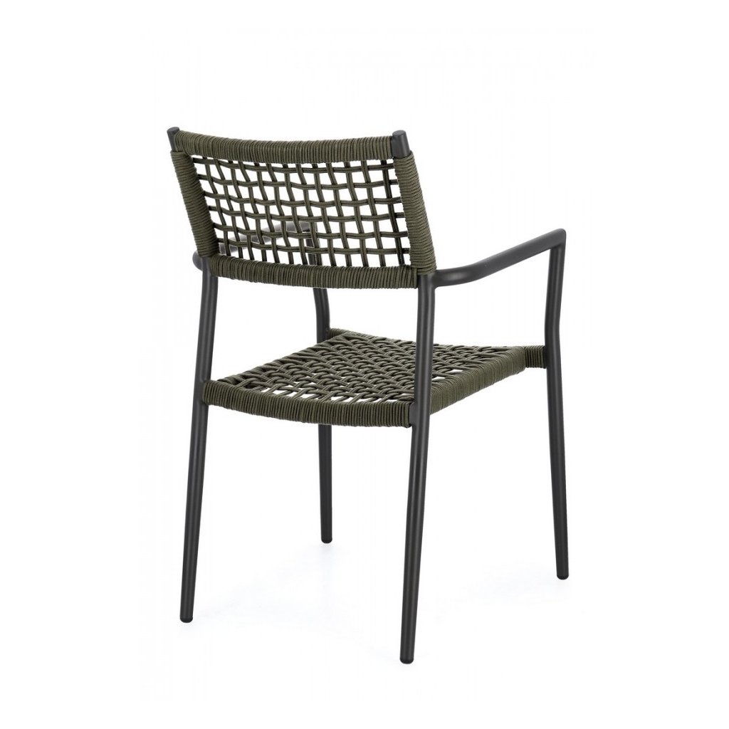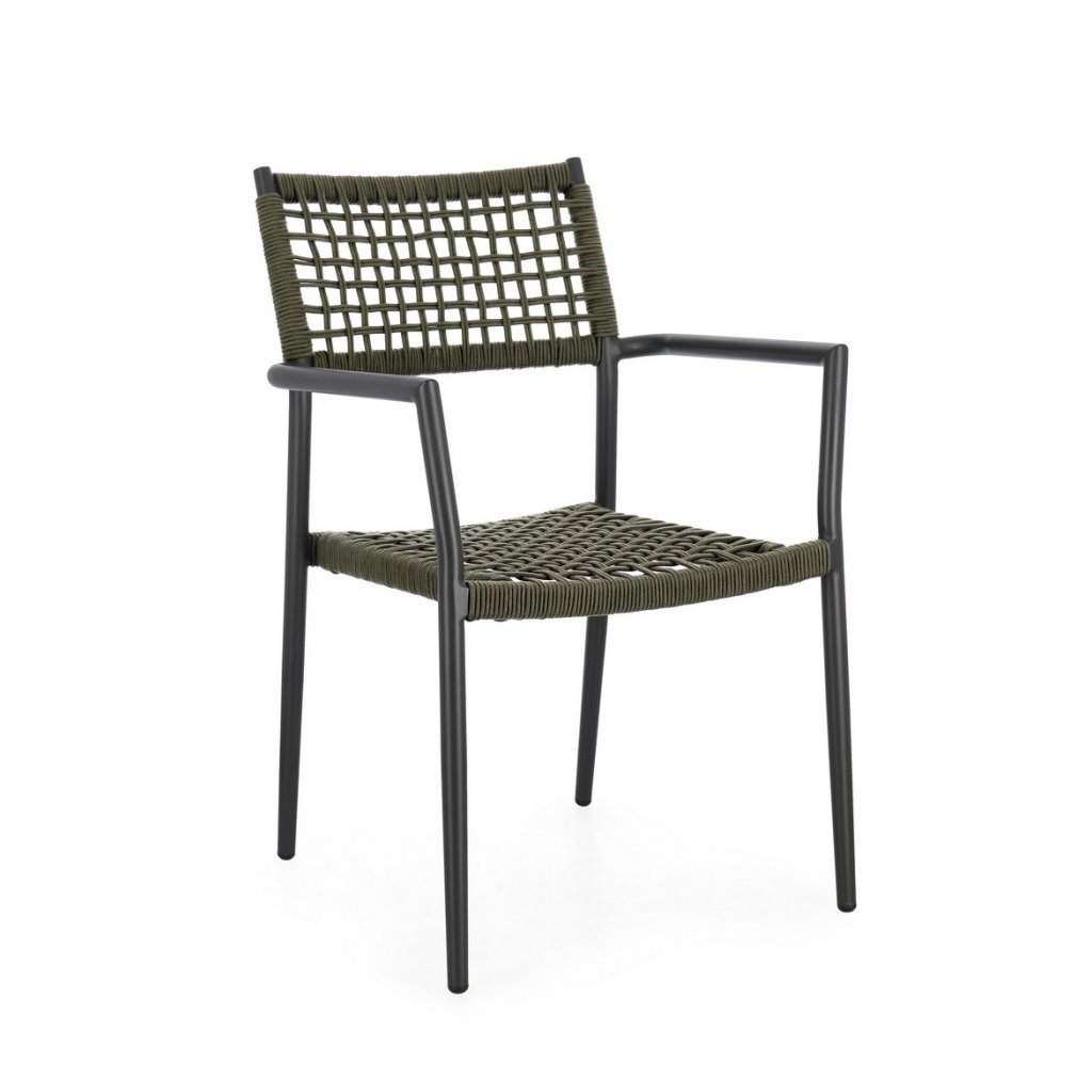Designová zahradní židle CALETA od italského výrobce stylového nábytku BIZZOTTO.  Židle CALETA je dodávána s konstrukcí z práškovaného hliníku v černé barvě.  Sedák a zadní opěrka je tvořena hlavně výpletem ze syntetického vlákna v tmavě zelené barvě. Pro větší komfort oceníte i kovové područky. Díky odolnému materiálu je možné využít jak uvnitř, tak i venku. Židle je plně stohovatelná, takže můžete na zimu uklidit.