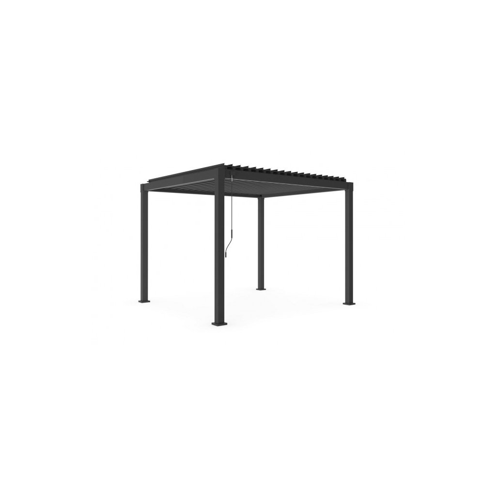Stylová zahradní hliníková pergola GARDA od italského výrobce stylového nábytku BIZZOTTO. Pergolu tvoří spodní 4 hliníkové nohy s rozměry 8x8 cm, které sahají do výšky 300 cm a je nutné je přivrtat k betonovému základu pro maximální stabilitu a odolnost. Na nohy navazuje samotná střecha, kterou tvoří kolmo umístěné hliníkové tyče s rozměry 13,5x4,5cm a vnitřní sklápěcí lamely. Lamely se sklápějí manuálně za pomoci přiložené kličky. Díky nim si můžete pouštět dovnitř světla dle vaší libosti a v případě deště zamezit tomu, aby vám pod ni pršelo. Je vybavena přilehlými kanálky podél střechy pro odvod dešťové vody.