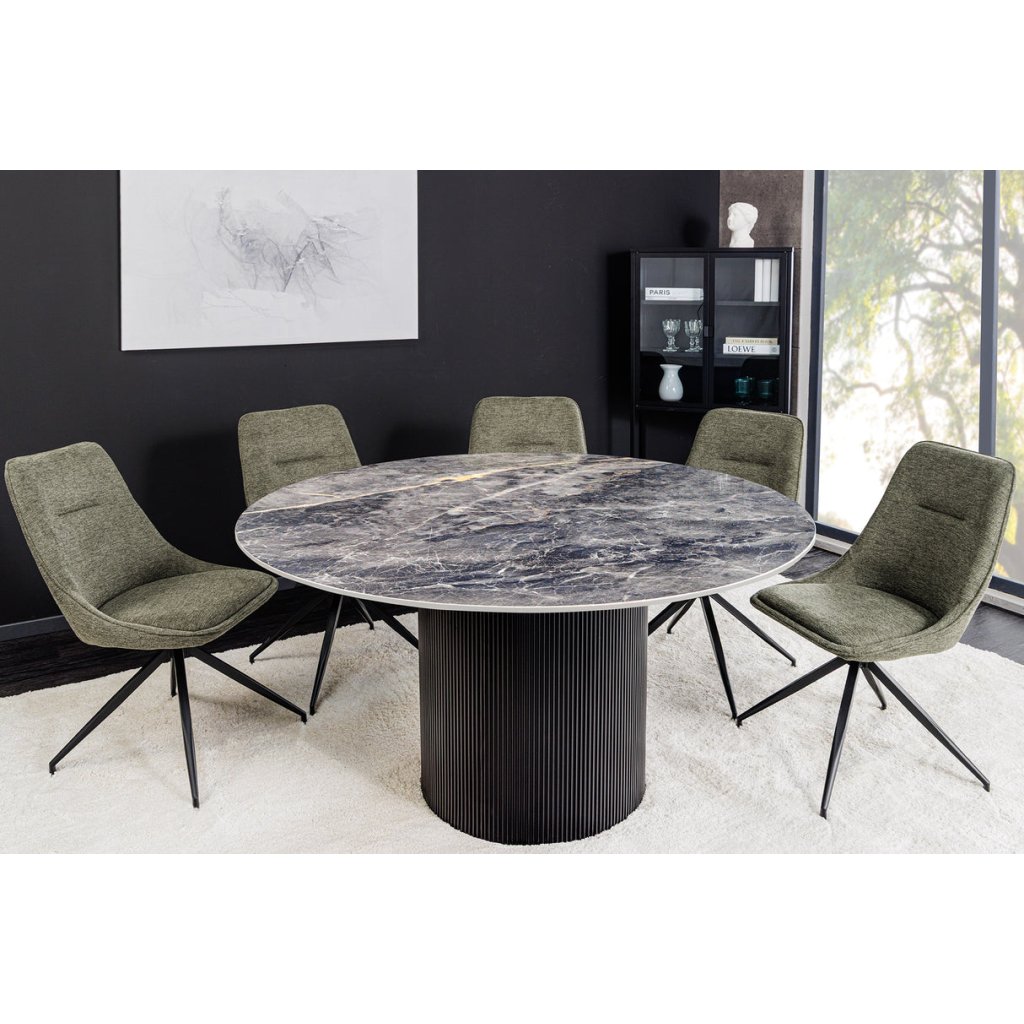 Tento stůl se perfektně hodí do moderních, skandinávských i minimalistických interiérů, kde vynikne jeho čistý kulatý tvar a elegantní barevná kombinace. Skvěle ladí s židlemi v přírodních tónech, s černými, šedými nebo dřevěnými prvky. Díky keramickému povrchu působí luxusně, ale zároveň prakticky. Je ideální pro každodenní použití i slavnostní chvíle. Vynikne ve světlých prostorech i v kontrastu s tmavší podlahou.