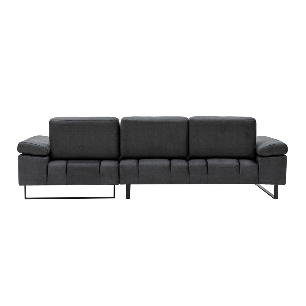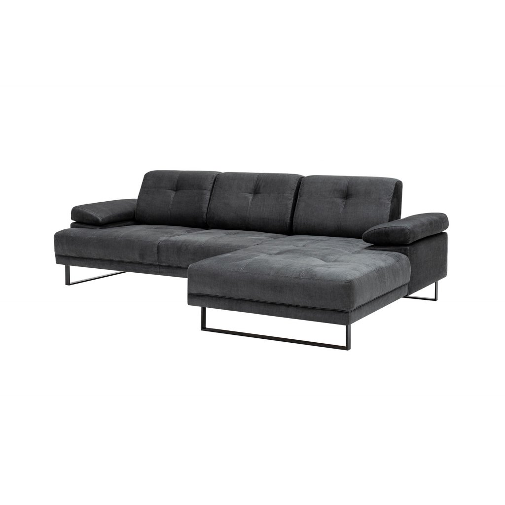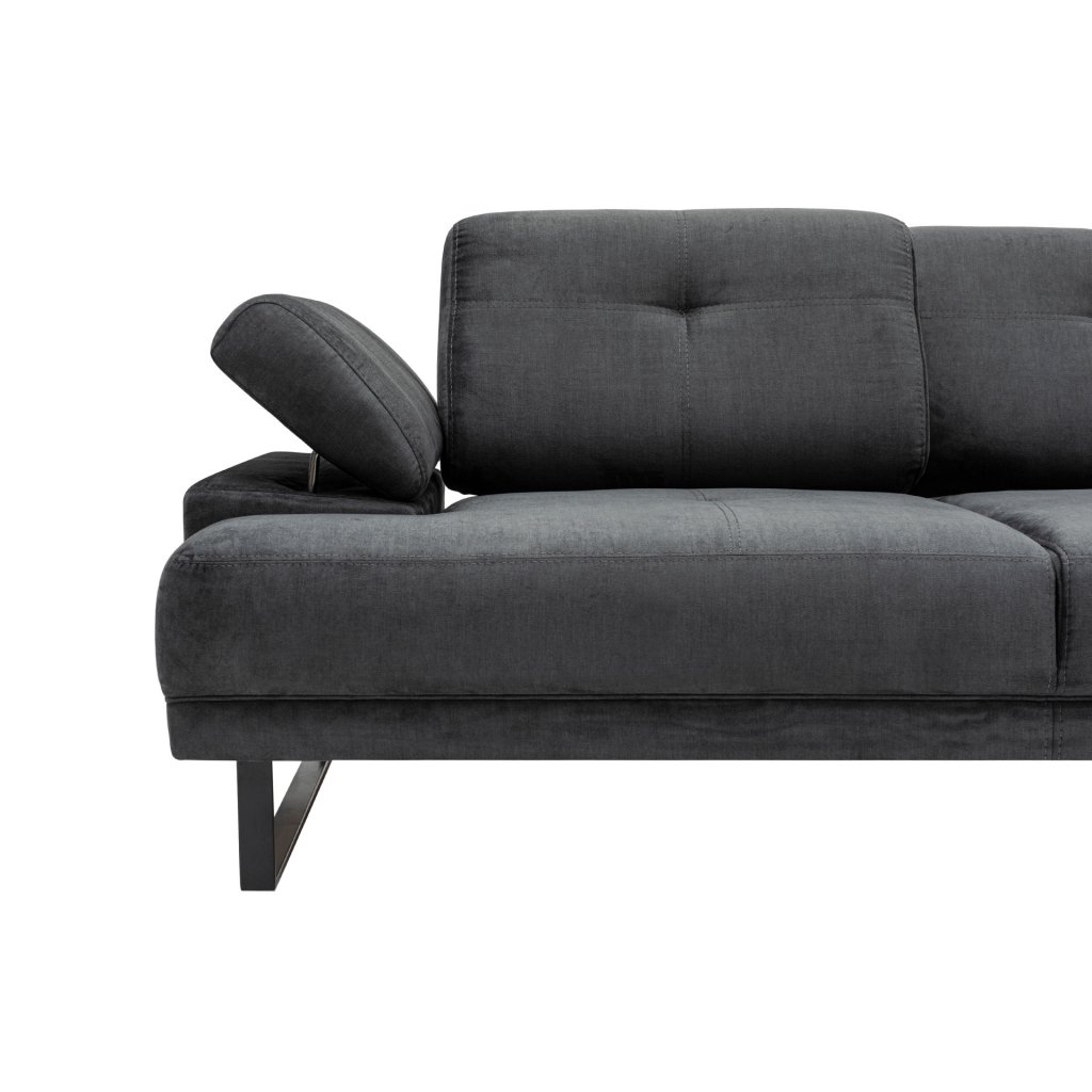 Krásná a stylová rohová pohovka MUSTANG od výrobce nábytku a pohovek Hanah Home. Stylová pohovka MUSTANG je tvořena kovovými nohami, které dodávají maximální stabilitu, nosnost a pevnost. Nohy mají černou matnou barvu a jsou připevněné ke konstrukci z bukového dřeva a dřevotřísky. Na konstrukci je přidělaná pěna pro vaše maximální pohodlí. Pohovku dále tvoří kvalitní potah z polyesteru v antracitové barvě. Pro ještě větší komfort je pohovka doplněna zadní pohyblivou opěrkou s nastavitelným ramenním mechanismem. Pohovka je velmi prostorná díky lenošce vpravo.