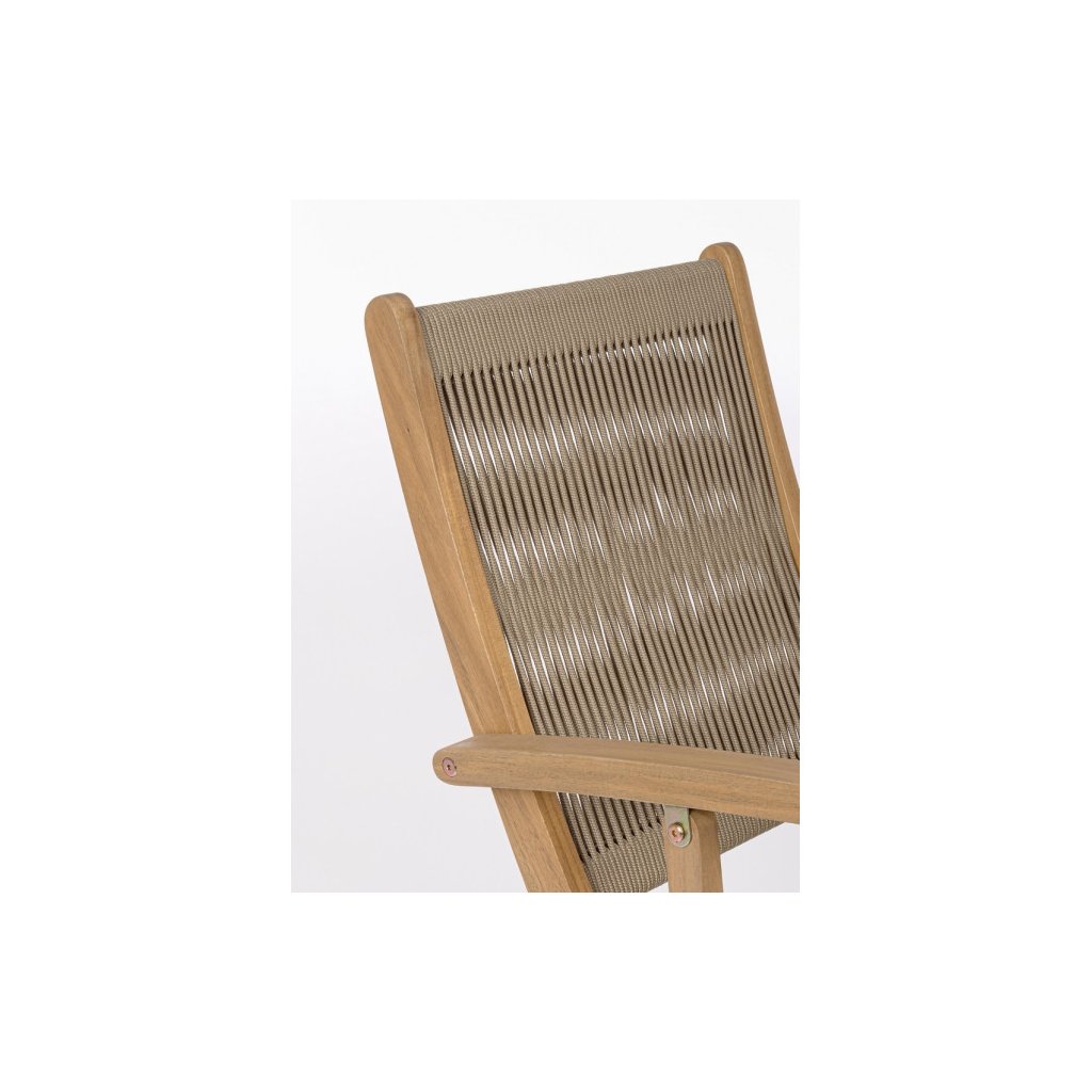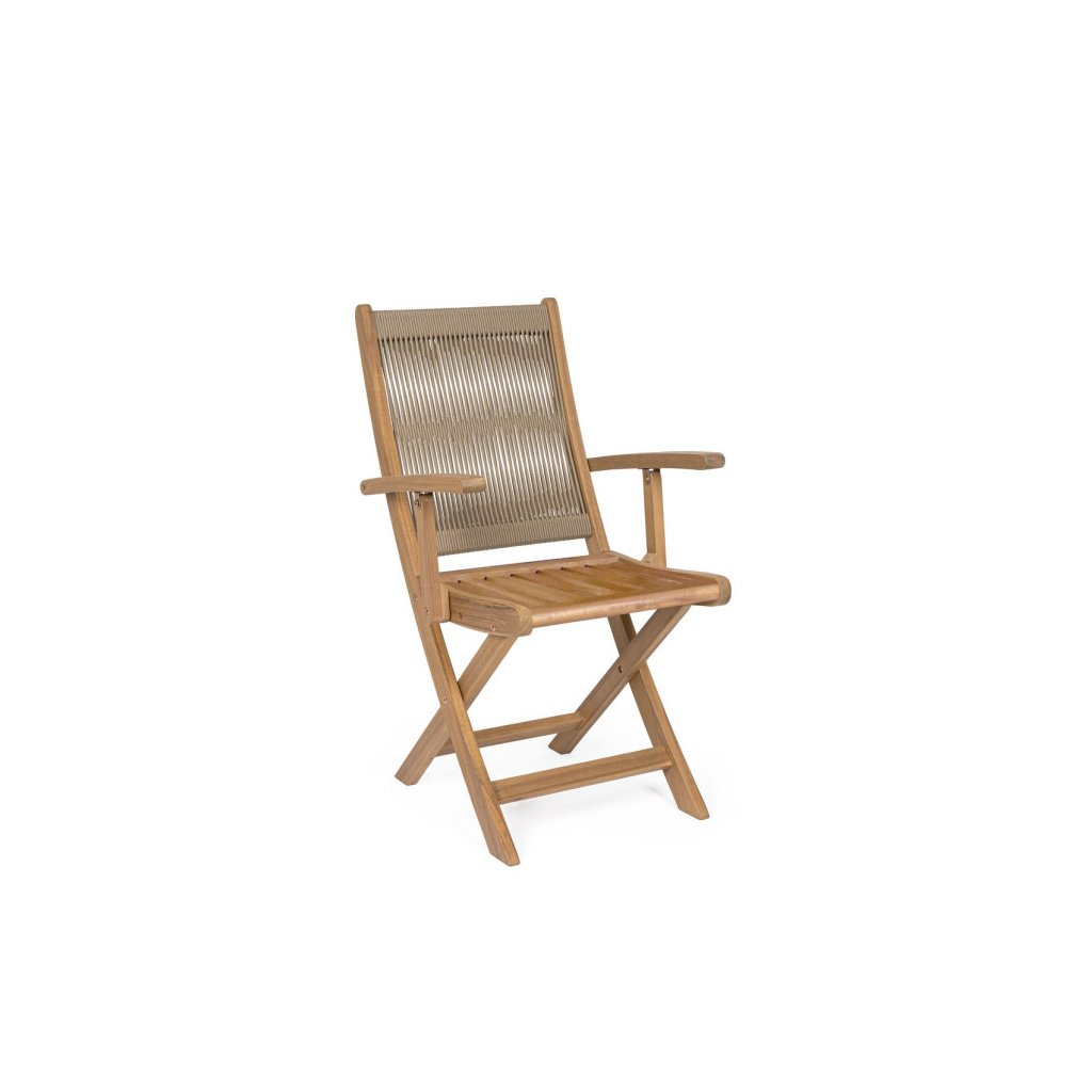 Stylová zahradní dřevěná židle DANUBIO od italského výrobce stylového nábytku BIZZOTTO. Židle má 4 decentní dřevěné nohy, které jsou navzájem propojeny dalšími laťkami. Nohy přecházejí v sedák, který má tvar mřížky z tenkých dřívek masivního akáciové dřeva, které se vyznačuje vysokou odolností proti nepříznivým venkovním vlivům. Dřevo je navíc ošetřeno olejem, díky čemuž se zvyšuje jeho odolnost a dostává tak krásnou hnědou barvu. Vrchní opěrka je pak tvořena propletenými lanky z polypropylenu v taupe barvě. Židle DANUBIO je skládací, takže je při potřebě uschování poměrně skladná.