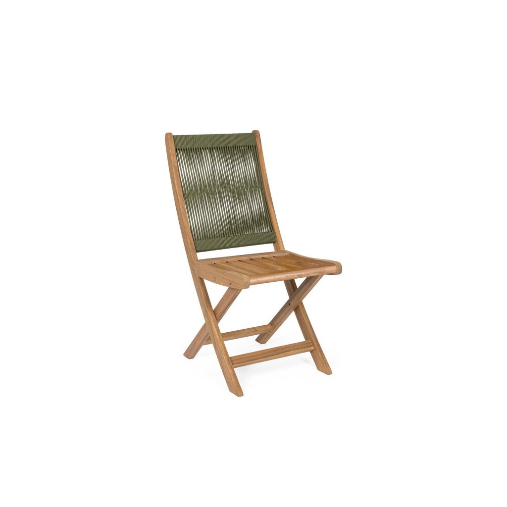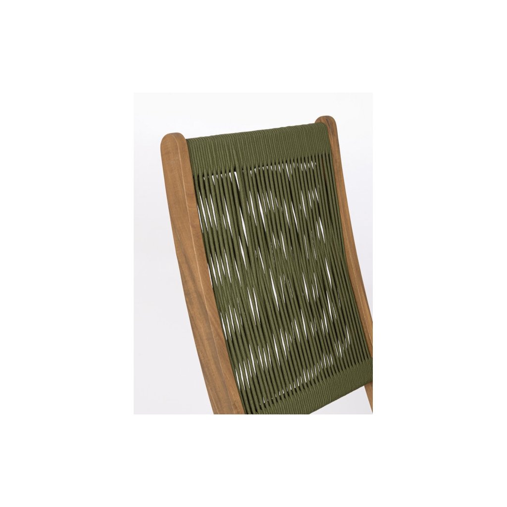 Stylová zahradní dřevěná židle DANUBIO od italského výrobce stylového nábytku BIZZOTTO. Židle má 4 decentní dřevěné nohy, které jsou navzájem propojeny dalšími laťkami. Nohy přecházejí v sedák, který má tvar mřížky z tenkých dřívek masivního akáciové dřeva, které se vyznačuje vysokou odolností proti nepříznivým venkovním vlivům. Dřevo je navíc ošetřeno olejem, díky čemuž se zvyšuje jeho odolnost a dostává tak krásnou hnědou barvu. Vrchní opěrka je pak tvořena propletenými lanky z polypropylenu v zelené barvě. Židle DANUBIO je skládací, takže je při potřebě uschování poměrně skladná.