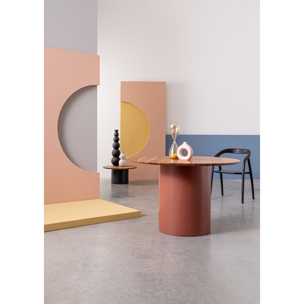 Stylový jídelní stůl OJAS od italského výrobce designového nábytku BIZZOTTO. Krásný a elegantní kulatý stůl tvoří spodní masivní válcová noha v hnědé barvě, na kterou navazuje dřevěná kulatá deska s průměrem 115 cm. Celý stůl je vyroben z akáciového dřeva.