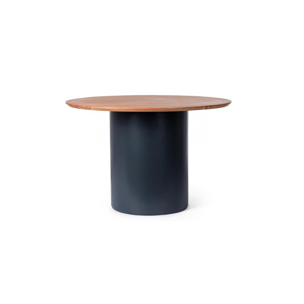 Stylový jídelní stůl OJAS od italského výrobce designového nábytku BIZZOTTO. Krásný a elegantní kulatý stůl tvoří spodní masivní válcová noha v tmavě modré barvě, na kterou navazuje dřevěná kulatá deska s průměrem 115 cm. Celý stůl je vyroben z akáciového dřeva.