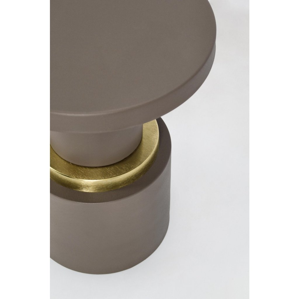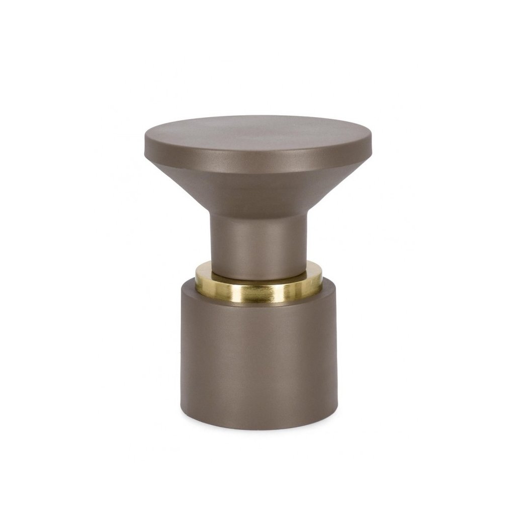 Designový odkládací stolek MUDIT od italského výrobce stylového nábytku BIZZOTTOStolek MUDIT je kompletně vyroben z oceli v hnědo-šedé matné barvě. Zajímavým doplňkem je zlatý prstenec, který zdobí centrální nohu a dodává stolku eleganci a luxusní vzhled. Vrchní deska má průměr 35 cm a stolek je ideální například do vašeho obývacího pokoje hned vedle pohovky pro odložení kávy nebo čaje.