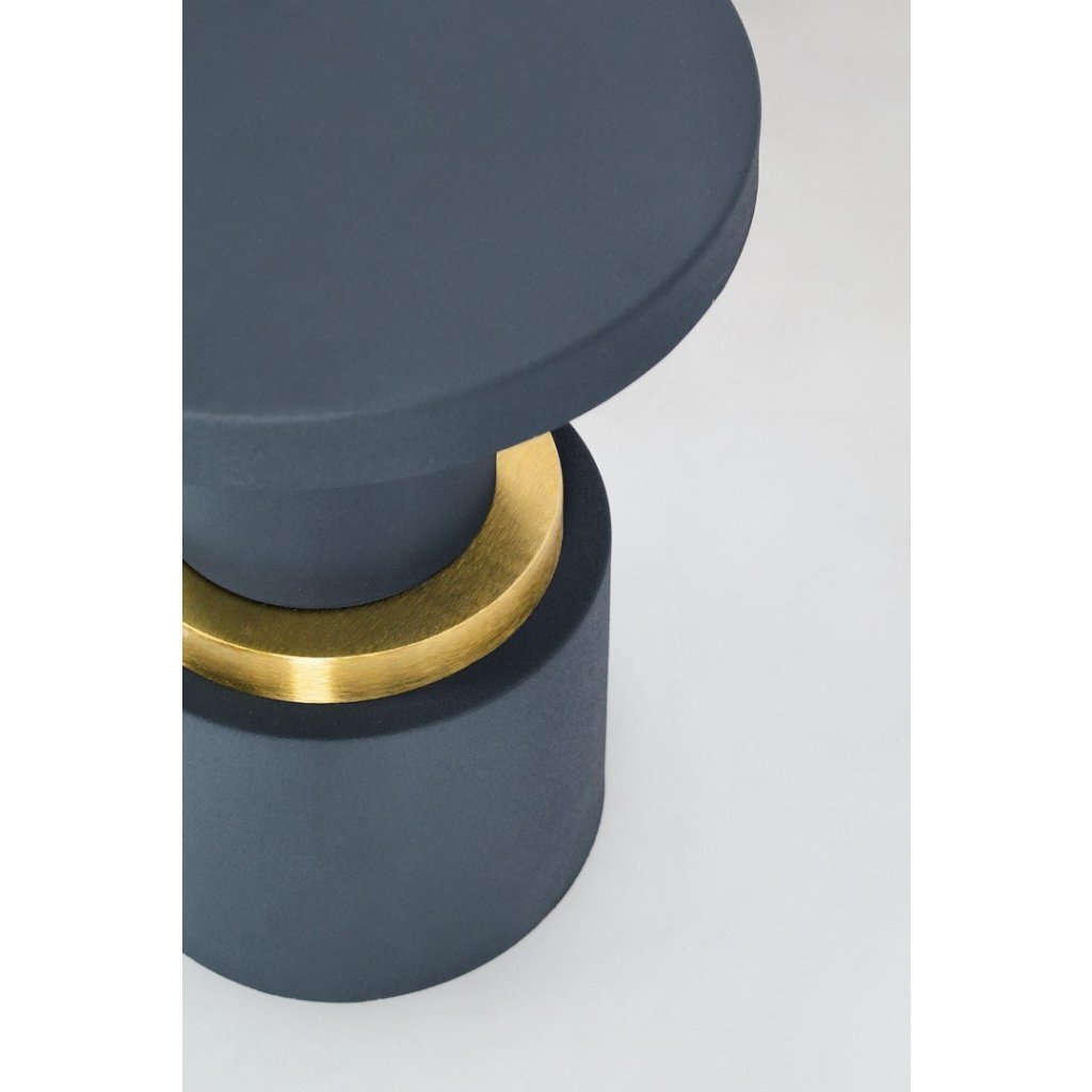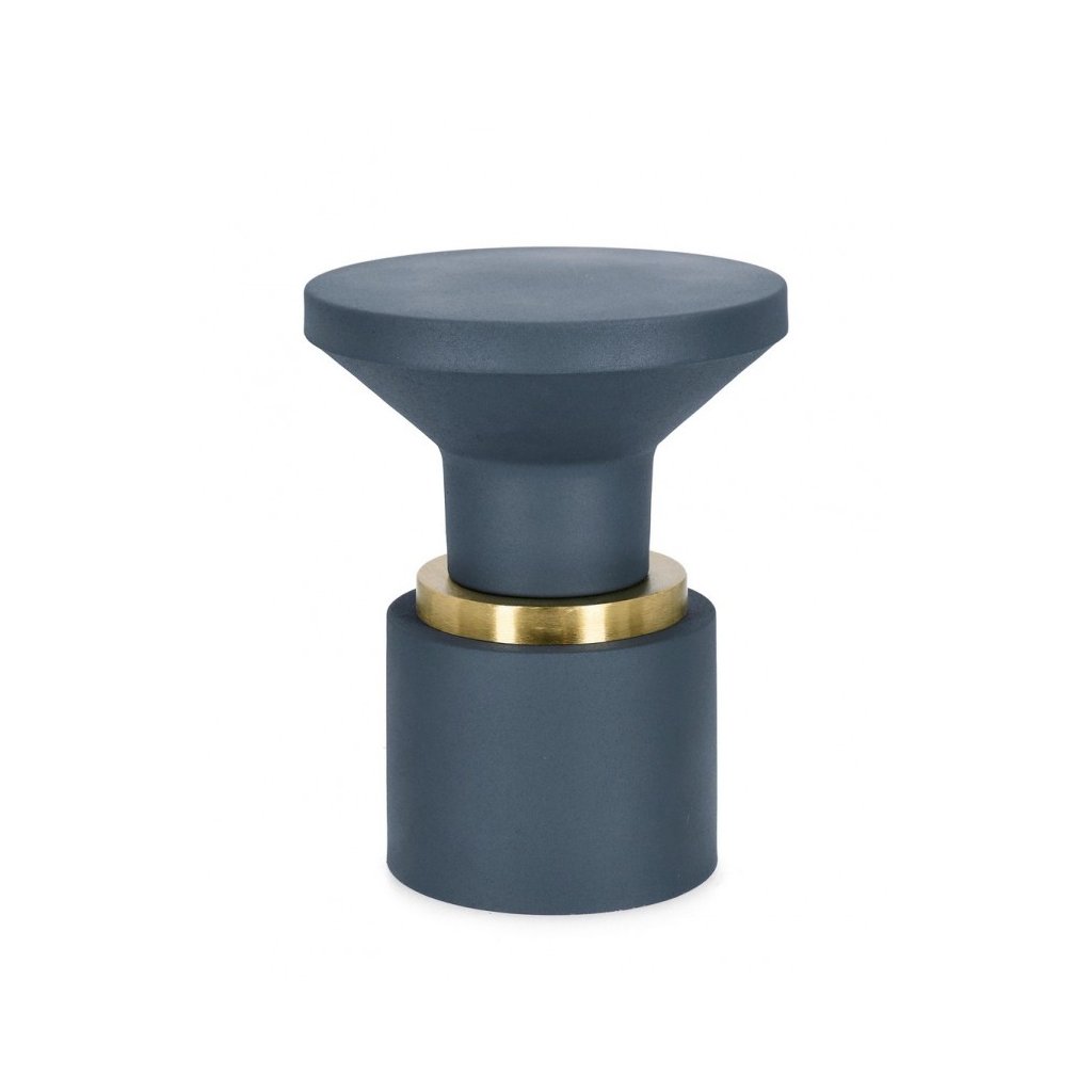 Designový odkládací stolek MUDIT od italského výrobce stylového nábytku BIZZOTTOStolek MUDIT je kompletně vyroben z oceli v modré matné barvě. Zajímavým doplňkem je zlatý prstenec, který zdobí centrální nohu a dodává stolku eleganci a luxusní vzhled. Vrchní deska má průměr 35 cm a stolek je ideální například do vašeho obývacího pokoje hned vedle pohovky pro odložení kávy nebo čaje.