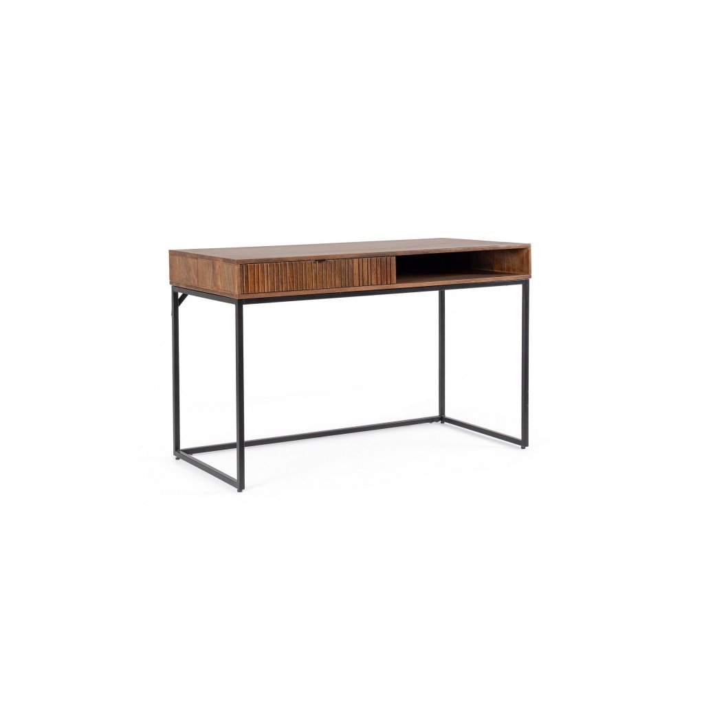 Industriální psací stůl TADITA od italského výrobce stylového nábytku BIZZOTTO. Stůl TADITA má bytelnou konstrukci z černě lakované oceli, což zajišťuje maximální nosnost a stabilitu. Vrchní část stolu tvoří deska z masivního mangového dřeva. Stůl doplňují 2 praktické úložné prostory.