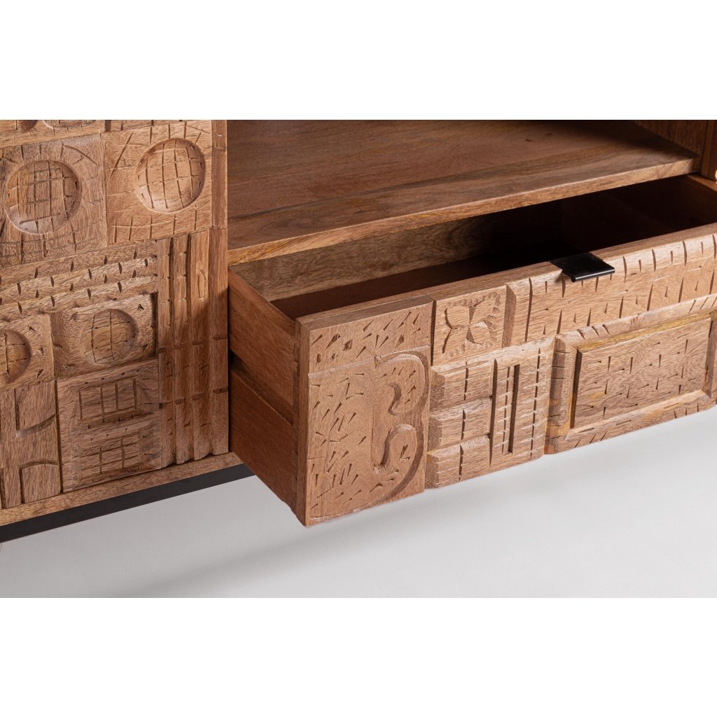 Designový TV stolek KINDIA od italské firmy stylového nábytku BIZZOTTO. Stolek má na levé a pravé straně do strany manipulovatelná dvířka, uprostřed výsuvnou zásuvku a prázdný prostor pro uložení například ovladačů. Stolek KINDIA je vyrobený z mangového dřeva s ozdobnými geometrickými rýhami na přední straně. Nohy stolku jsou z černé práškované oceli a zajišťují maximální stabilitu a pevnost. Velice originální masivní kousek bude krásnou dominantou vaší domácnosti.