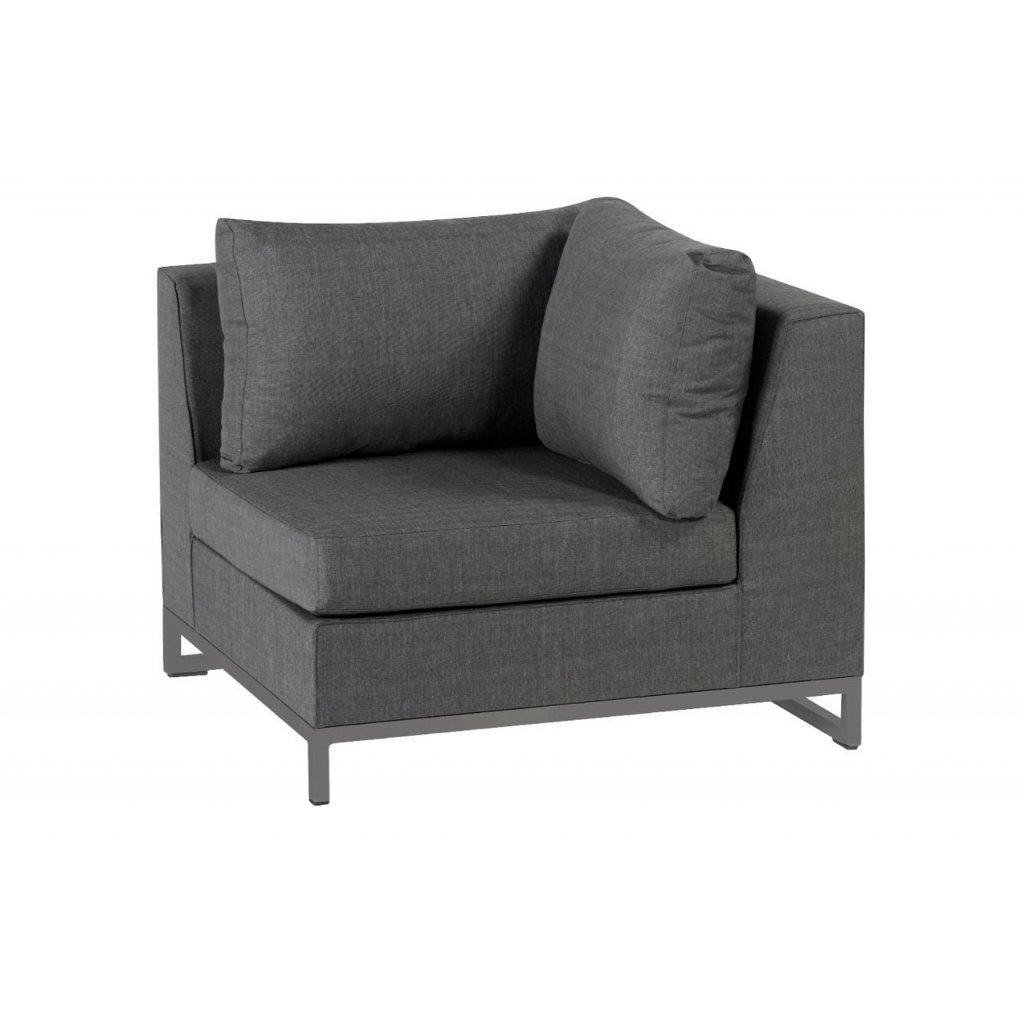 Rohový díl zahradní pohovky RHODOS od holandského výrobce nádherného zahradního nábytku EXOTAN. Díl má kovovou konstrukci z lehkého a odolného hliníku v tmavě šedé barvě. Hliník je odolný vůči povětrnostním vlivům, díky čemuž je nenáročný na údržbu. Pohodlné sezení zajišťují příjemné polštáře. Tyto polštáře jsou vyrobeny ze silné tkaniny v šedé barvě. Silná, pružná vnější tkanina zajišťuje, že většina (dešťové) vody nepronikne látkou. Voda, která si přes látku najde cestu, bude rychle odváděna rychleschnoucí pěnovou výplní. Tím se zabrání poškození a plísním. Prostřední díl RHODOS lze použít také samostatně jako křeslo. Pro dokonalý vzhled křeslo doplňte dalším zahradním nábytkem ze stejné kolekce RHODOS.