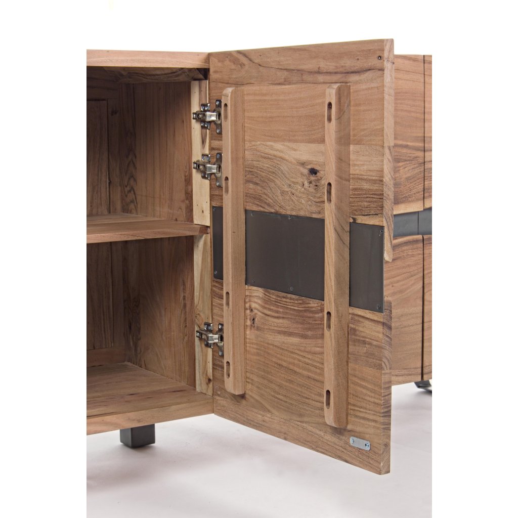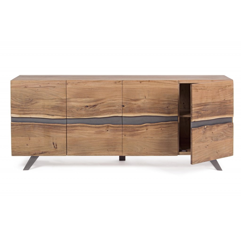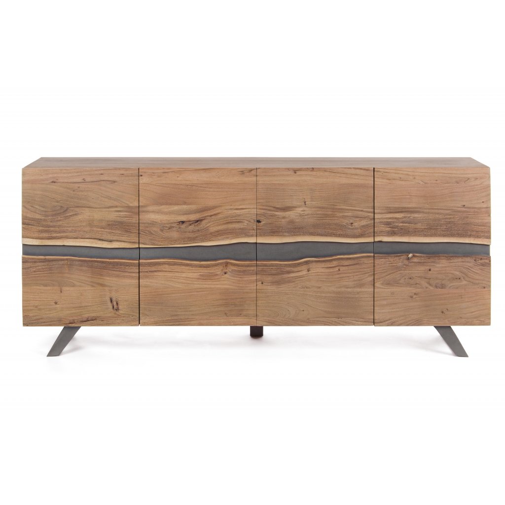 Designová komoda ARON od italského výrobce stylového nábytku BIZZOTTO. Krásná komoda je vyrobena z velmi kvalitního a moderního akáciového dřeva s velmi zajímavým vzorem. Hlavní oporu tvoří 2 spojené nohy do U a jedna podpěrná noha uprostřed komody z černě práškované oceli. Tato komoda zaujme především svým moderním zpracováním. Je velmi bytelná, mohutná a prostorná. Praktické úložiště zajišťují 4 skříňky se 2 policemi do kterých můžete uložit cokoliv. Komoda se hodí jak do moderního tak klasického interiéru.