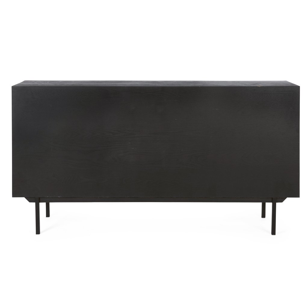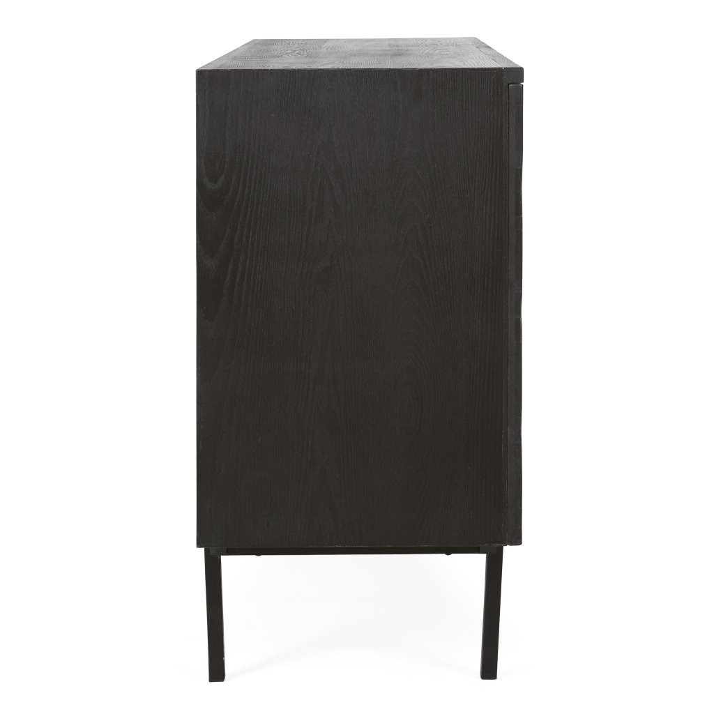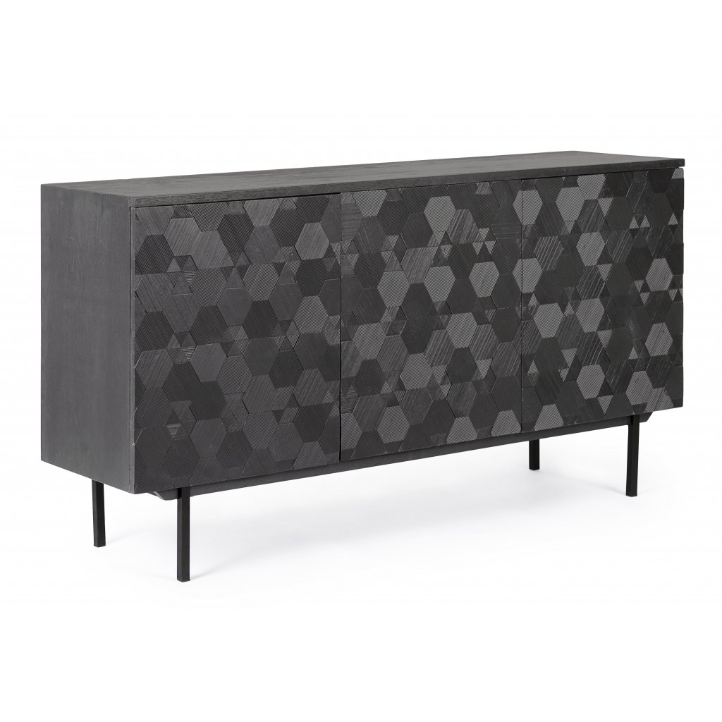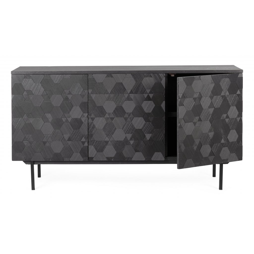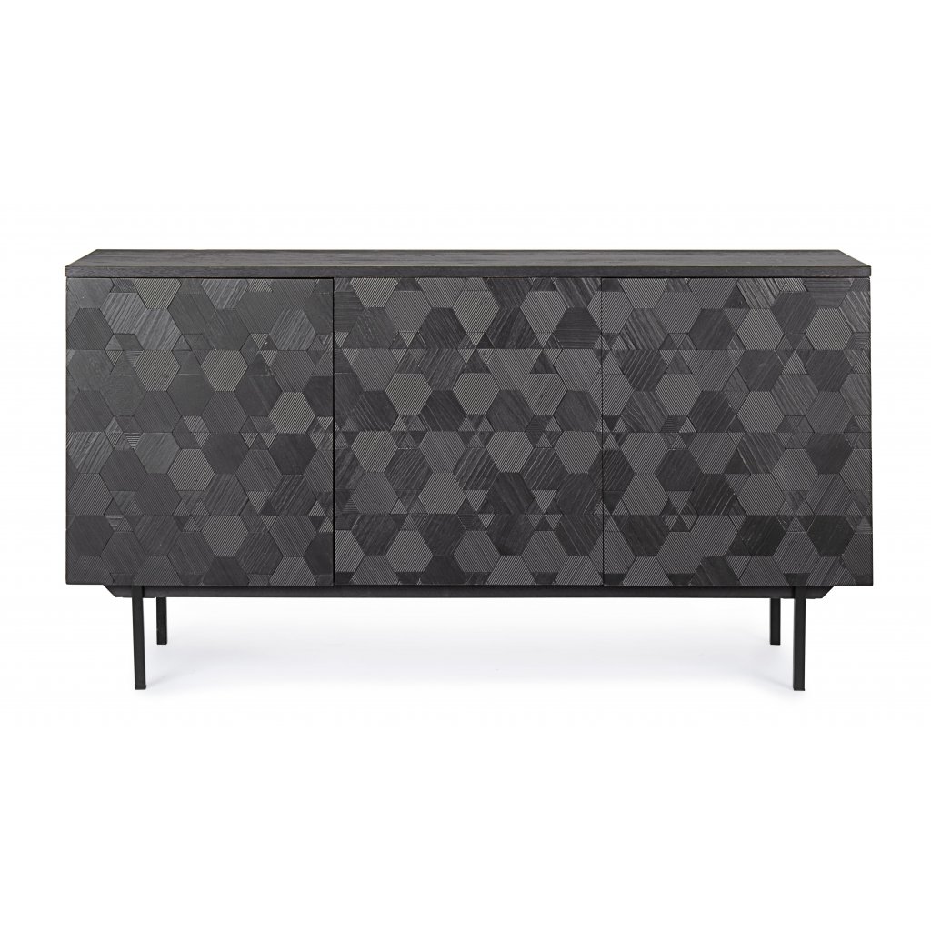 Designová komoda EULALIA od italského výrobce nábytku BIZZOTTO. Komodu tvoří 4 kovové ocelové nohy v černé barvě. Samotná kostra včetně vnitřních polic je vyrobena z černě lakované dřevovláknité mdf desky. Přední část tvoří 3 nádherná dvířka z jasanového dřeva s fantastickými geometrickými vzory. Za dvířky Vás pak čeká krásný úložný prostor rozdělený na jednotlivé police.
