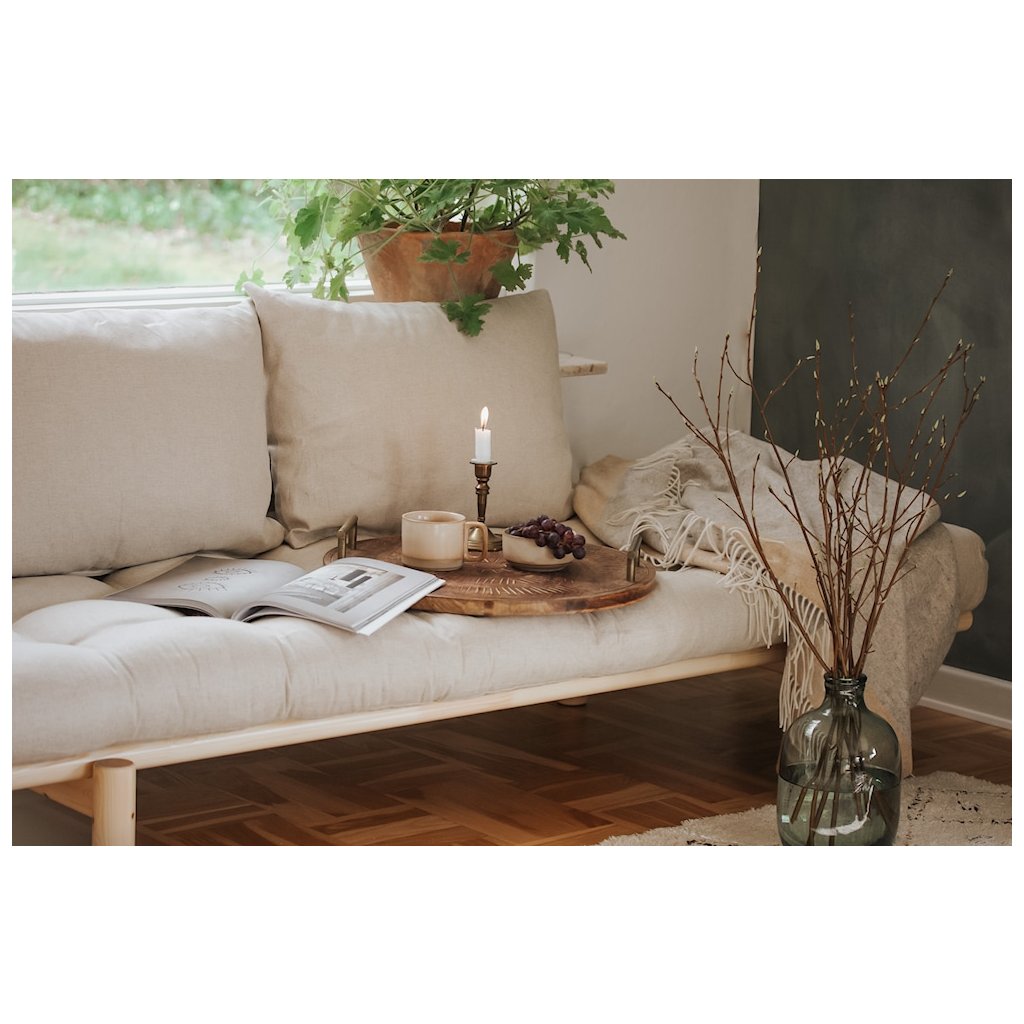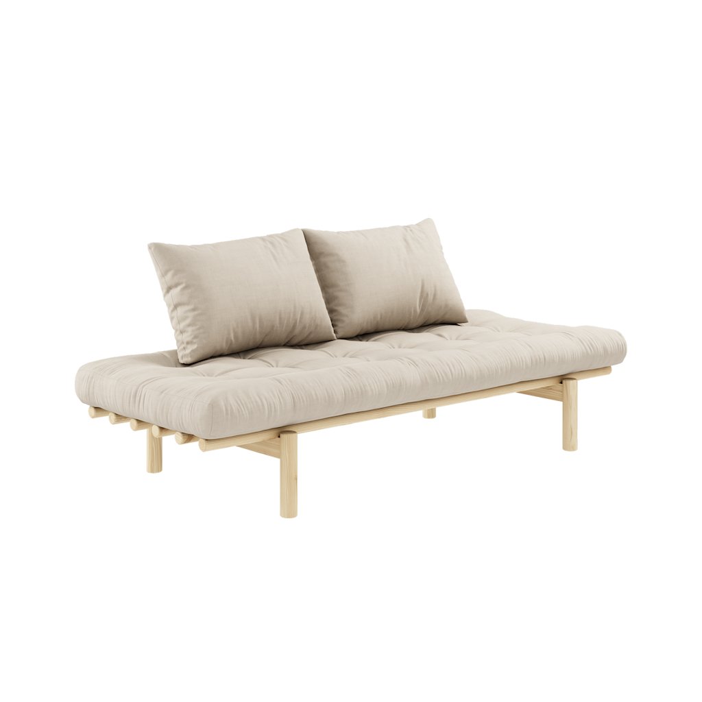 Stylová pohovka PACE od výrobce stylového nábytku a pohovek KARUP DESIGN. Pohovka je dodávána z vysoce kvalitního borovicového dřeva s certifikací FSC ve světlém provedení a výplní futonové matrace z pěny, kterou pokrývá bavlněný a polyesterový povlak ve světle béžové barvě. Futonová matrace je velmi pohodlná a příjemná na dotyk. Moderní kus nábytku s rozměry 75x200 cm, který vytvoří ve vaší domácnosti klid a pohodlí. Vyniká jednoduchým designem, který se snadno začlení do každého interiéru.