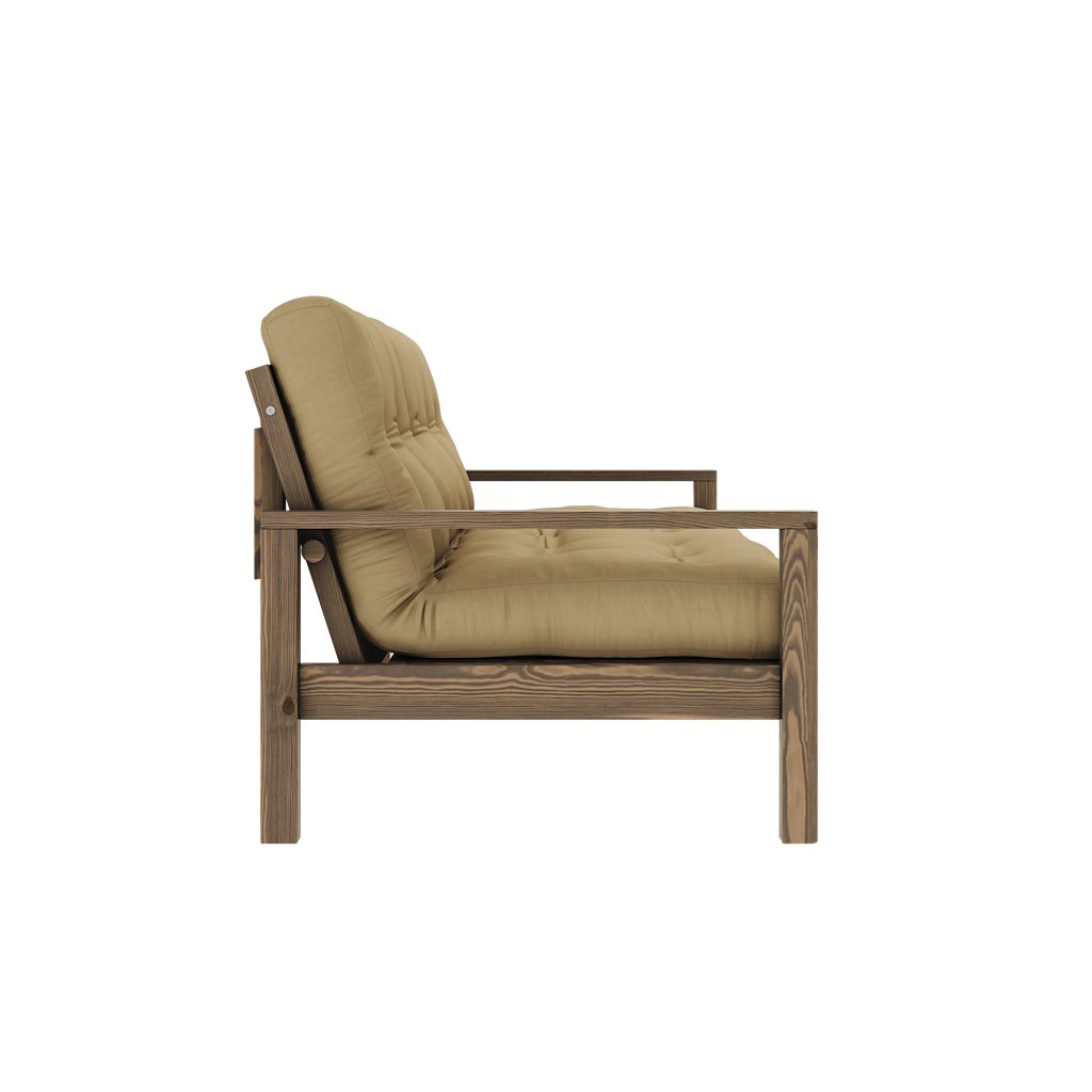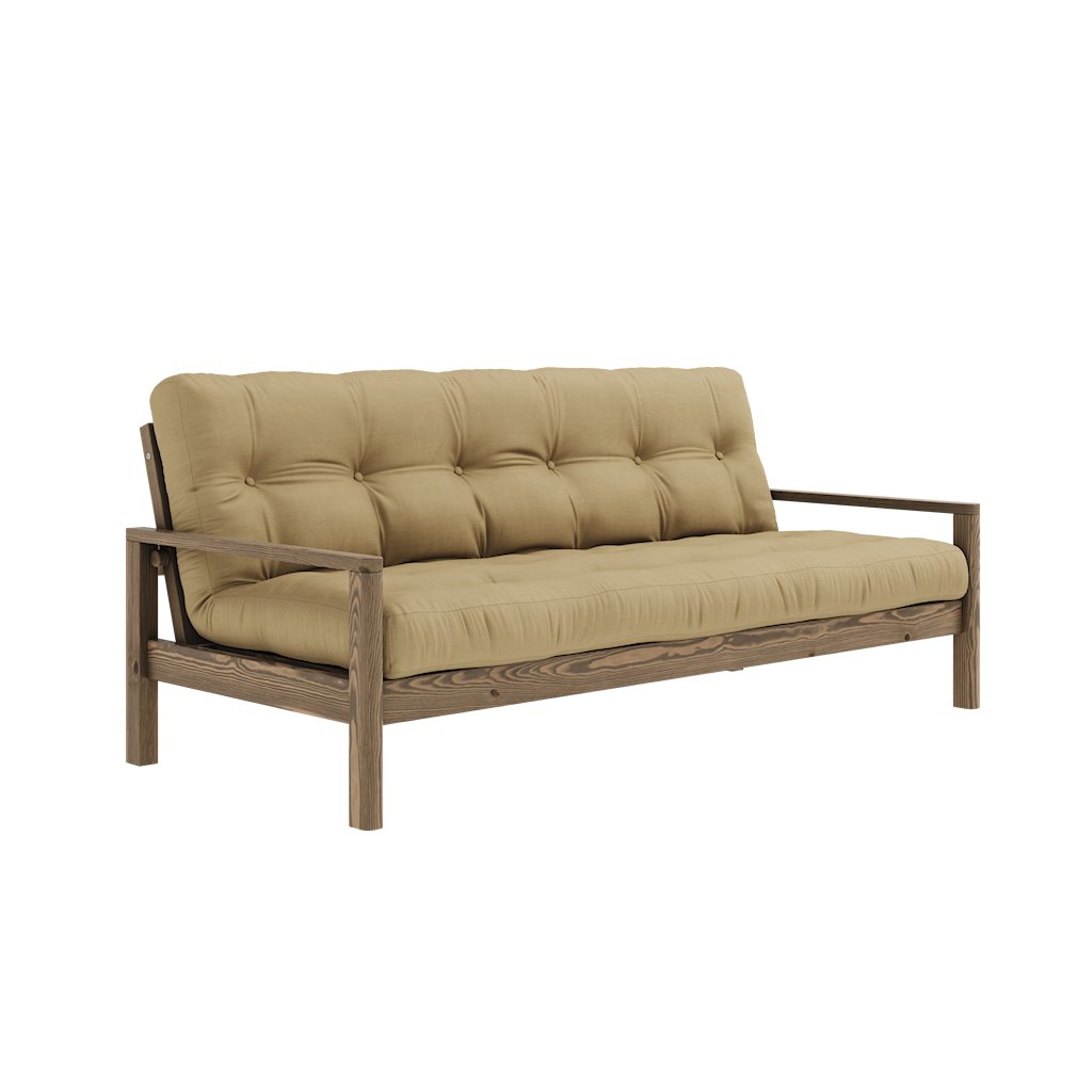 Dřevěná rozkládací pohovka KNOB od dánského výrobce stylového nábytku KARUP DESIGN. Pohovka je vyrobena z vysoce kvalitního borovicového dřeva s certifikací FSC ve tmavém provedení. Pohovka je osazena futonovou matrací s pěnovou výplní, která je potažena odolným povlakem z bavlny a polyesteru v jemné béžové barvě. Moderní vzhled, precizní zpracování a elegantní nohy dodávají pohovce KNOB nadčasový charakter a činí ji ideální volbou do moderních i skandinávských interiérů. Díky délce 205 cm nabízí pohodlné sezení až pro 3 osoby. Jednoduchým rozložením získáte plnohodnotné místo na spaní o rozměrech 130x205 cm, které poskytne dostatek prostoru pro pohodlné přespání vaší návštěvy.