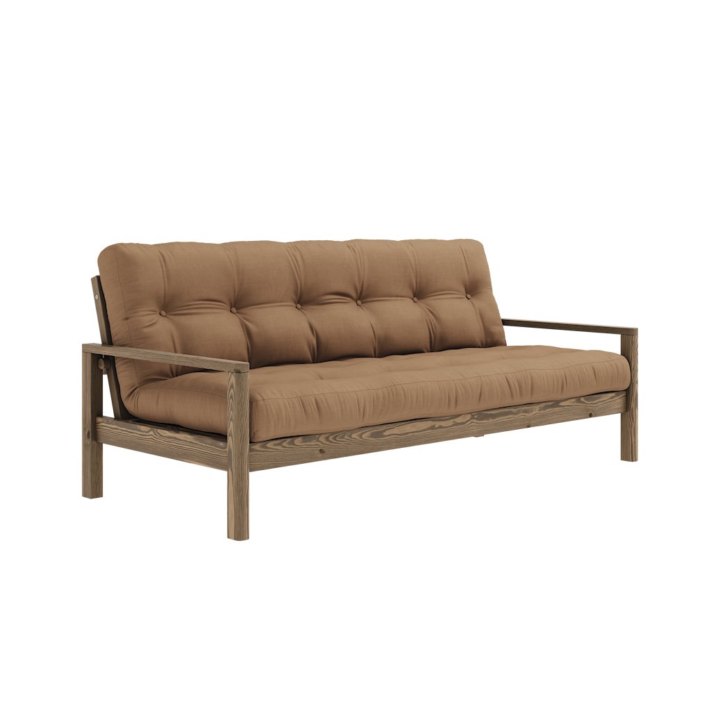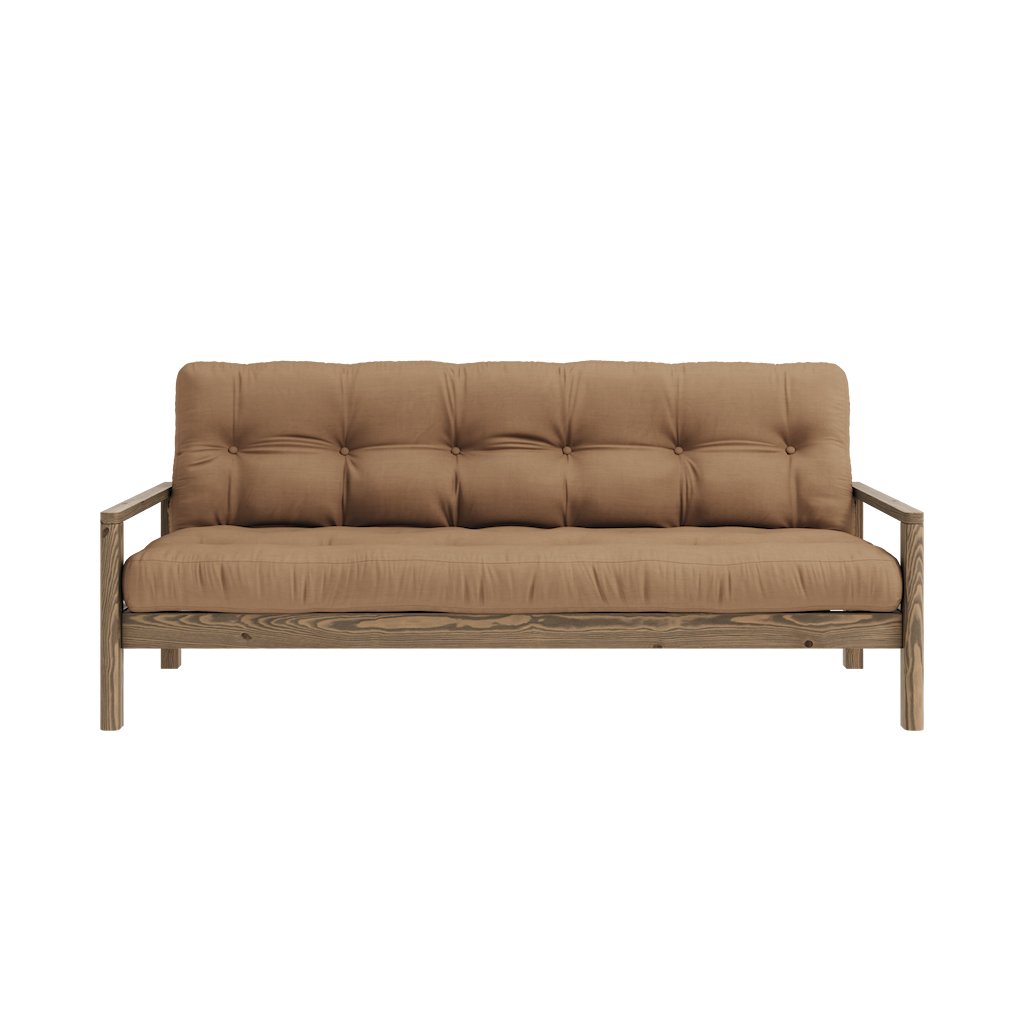 Dřevěná rozkládací pohovka KNOB od dánského výrobce stylového nábytku KARUP DESIGN. Pohovka je vyrobena z vysoce kvalitního borovicového dřeva s certifikací FSC ve tmavém provedení. Pohovka je osazena futonovou matrací s pěnovou výplní, která je potažena odolným povlakem z bavlny a polyesteru v jemné hnědé barvě. Moderní vzhled, precizní zpracování a elegantní nohy dodávají pohovce KNOB nadčasový charakter a činí ji ideální volbou do moderních i skandinávských interiérů. Díky délce 205 cm nabízí pohodlné sezení až pro 3 osoby. Jednoduchým rozložením získáte plnohodnotné místo na spaní o rozměrech 130x205 cm, které poskytne dostatek prostoru pro pohodlné přespání vaší návštěvy.