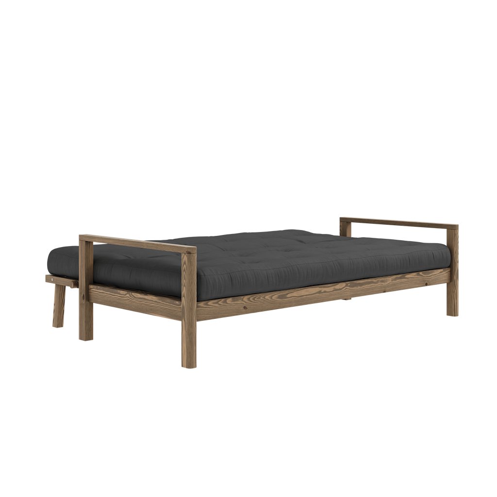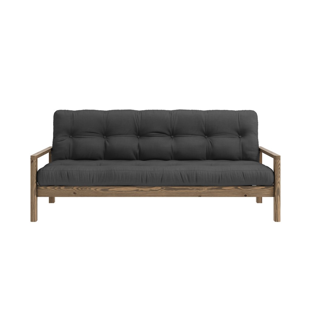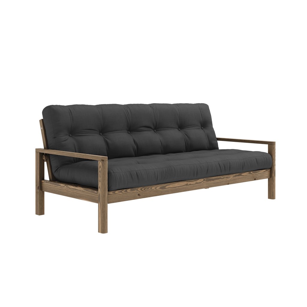 Dřevěná rozkládací pohovka KNOB od dánského výrobce stylového nábytku KARUP DESIGN. Pohovka je vyrobena z vysoce kvalitního borovicového dřeva s certifikací FSC ve tmavém provedení. Pohovka je osazena futonovou matrací s pěnovou výplní, která je potažena odolným povlakem z bavlny a polyesteru v jemné tmavě šedé barvě. Moderní vzhled, precizní zpracování a elegantní nohy dodávají pohovce KNOB nadčasový charakter a činí ji ideální volbou do moderních i skandinávských interiérů. Díky délce 205 cm nabízí pohodlné sezení až pro 3 osoby. Jednoduchým rozložením získáte plnohodnotné místo na spaní o rozměrech 130x205 cm, které poskytne dostatek prostoru pro pohodlné přespání vaší návštěvy.