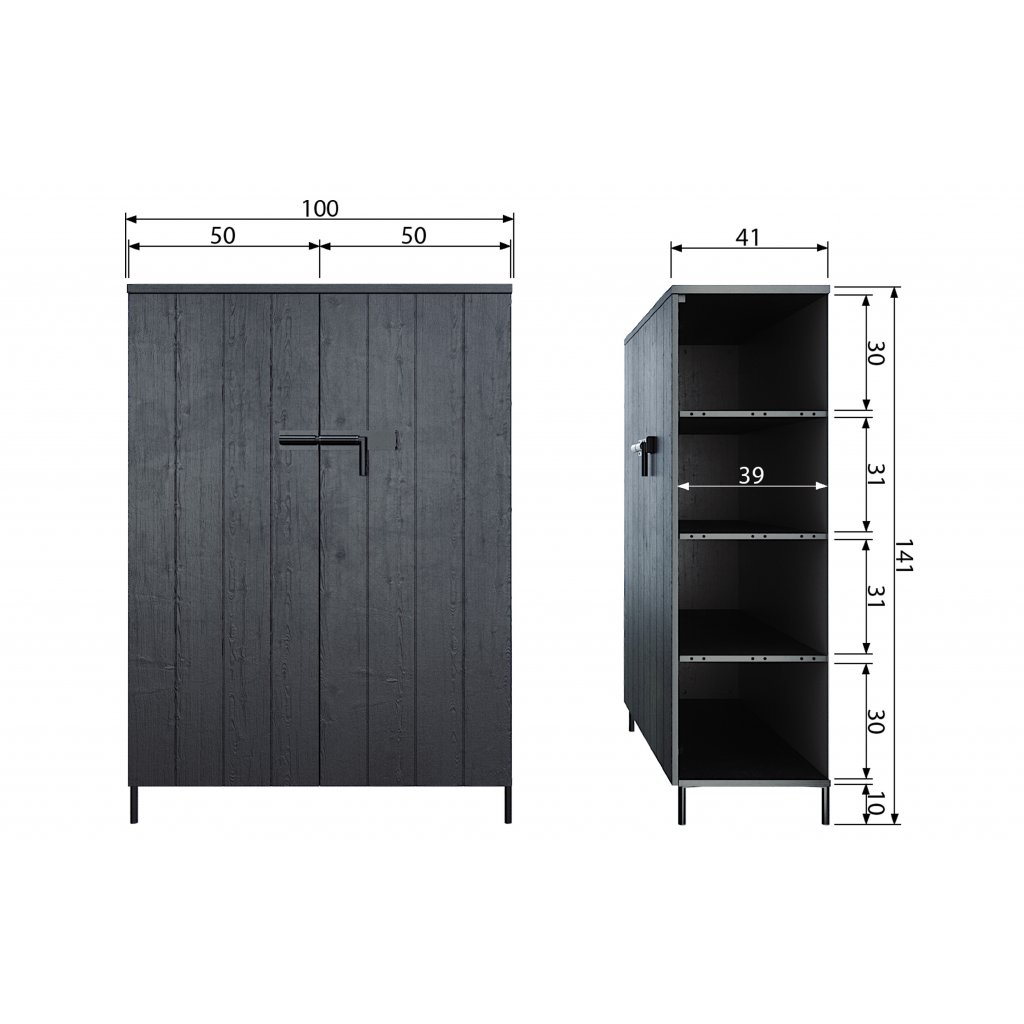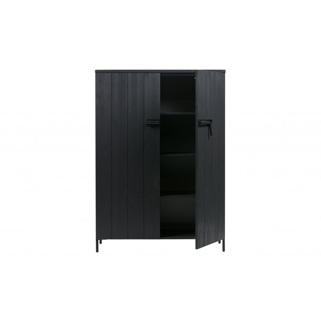 Stylová skříňka BRUUT od holandského výrobce nábytku WOOOD. DENNIS tvoří konstrukci a boční desky z černého masivního dřeva borovice. Maximální robustnost a stabilitu pak zajišťují 4 tenké kovové nohy. Přední část představují 2 dopředu otevíratelné dveře s jemnými rýhami a černou kovovou zápatkou. Za nimi se skrývá úložný prostor rozdělený 4 police pro úschovu vašich potřebných věcí. Použité broušené borovicové dřevo bylo vyrobeno ekologicky a pyšní se certifikátem FSC.