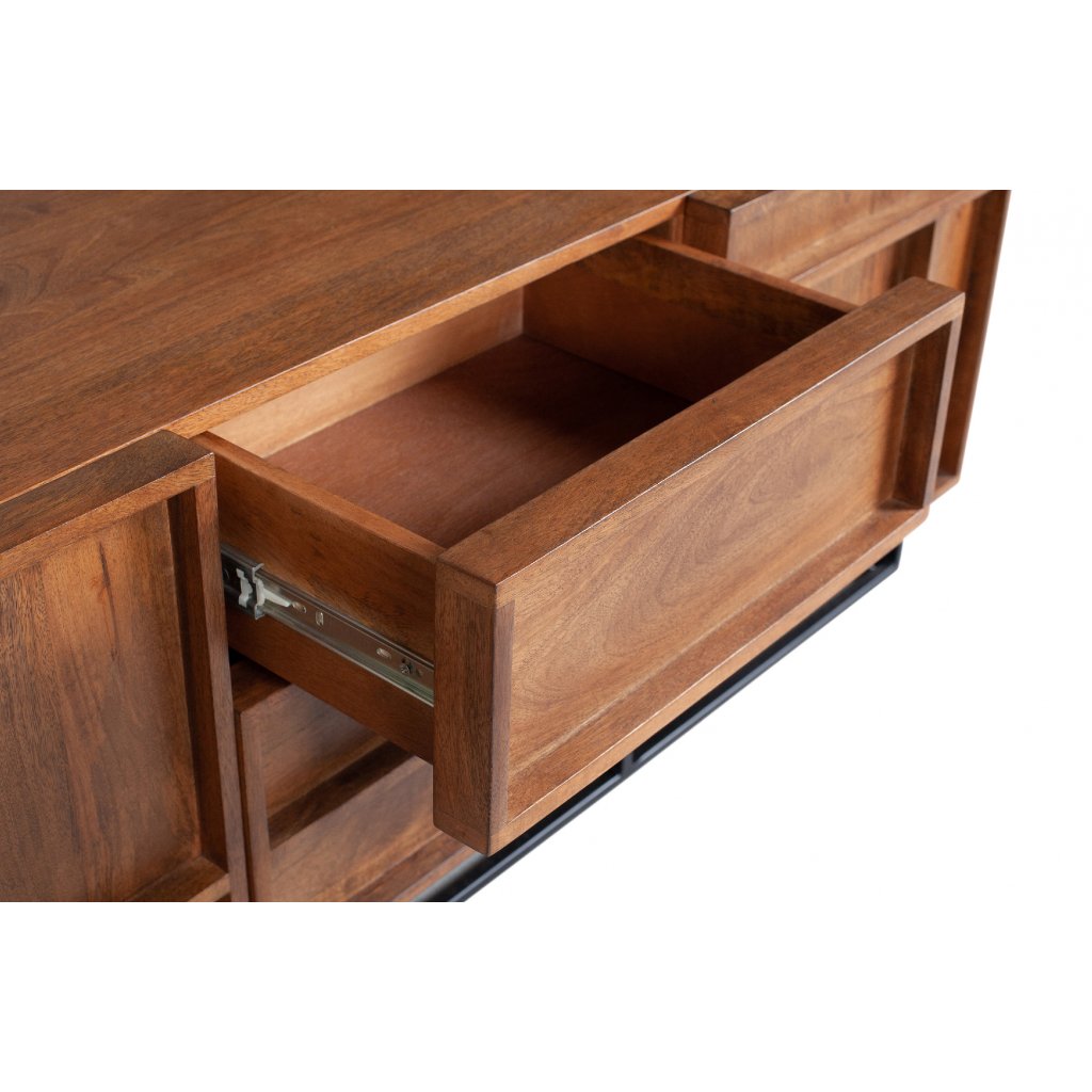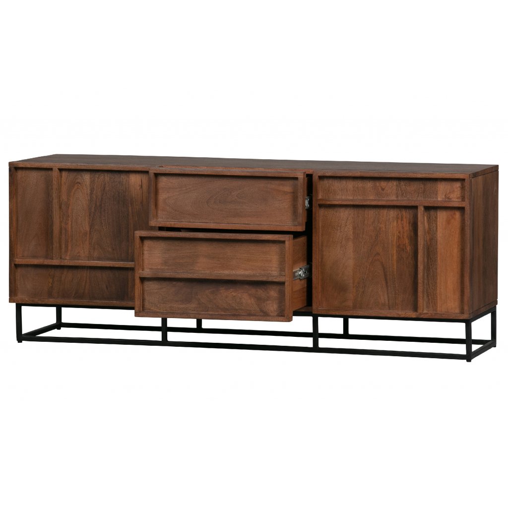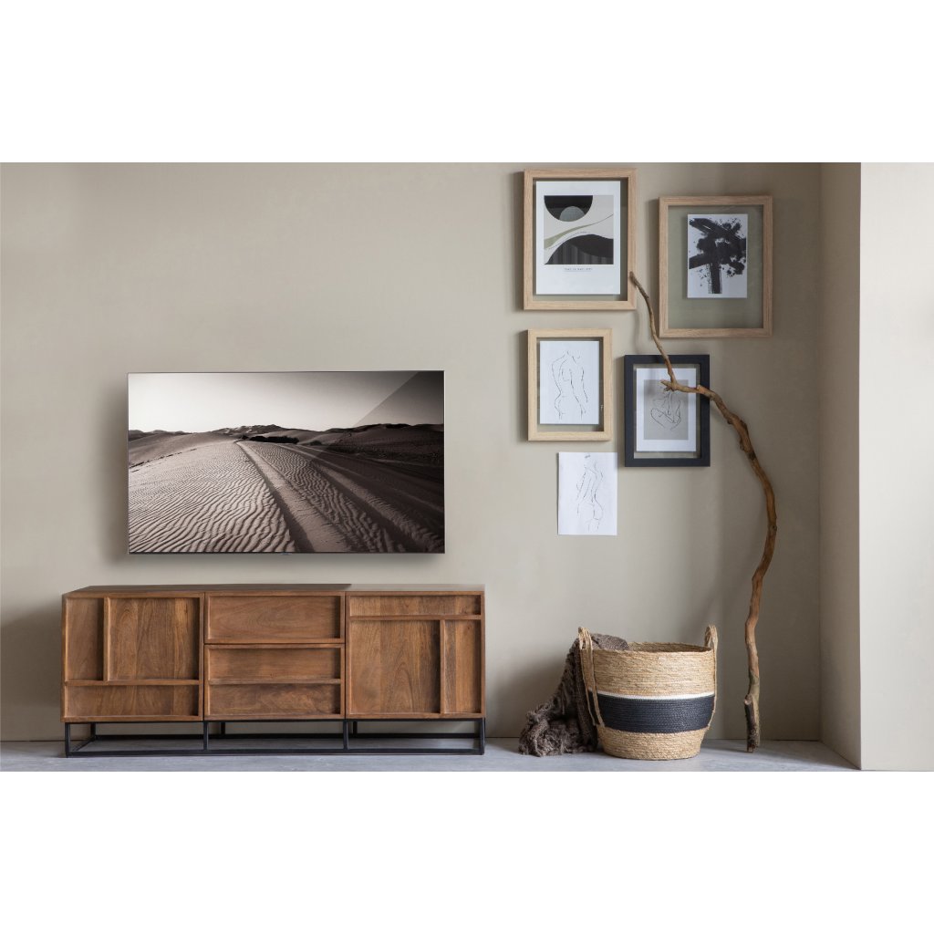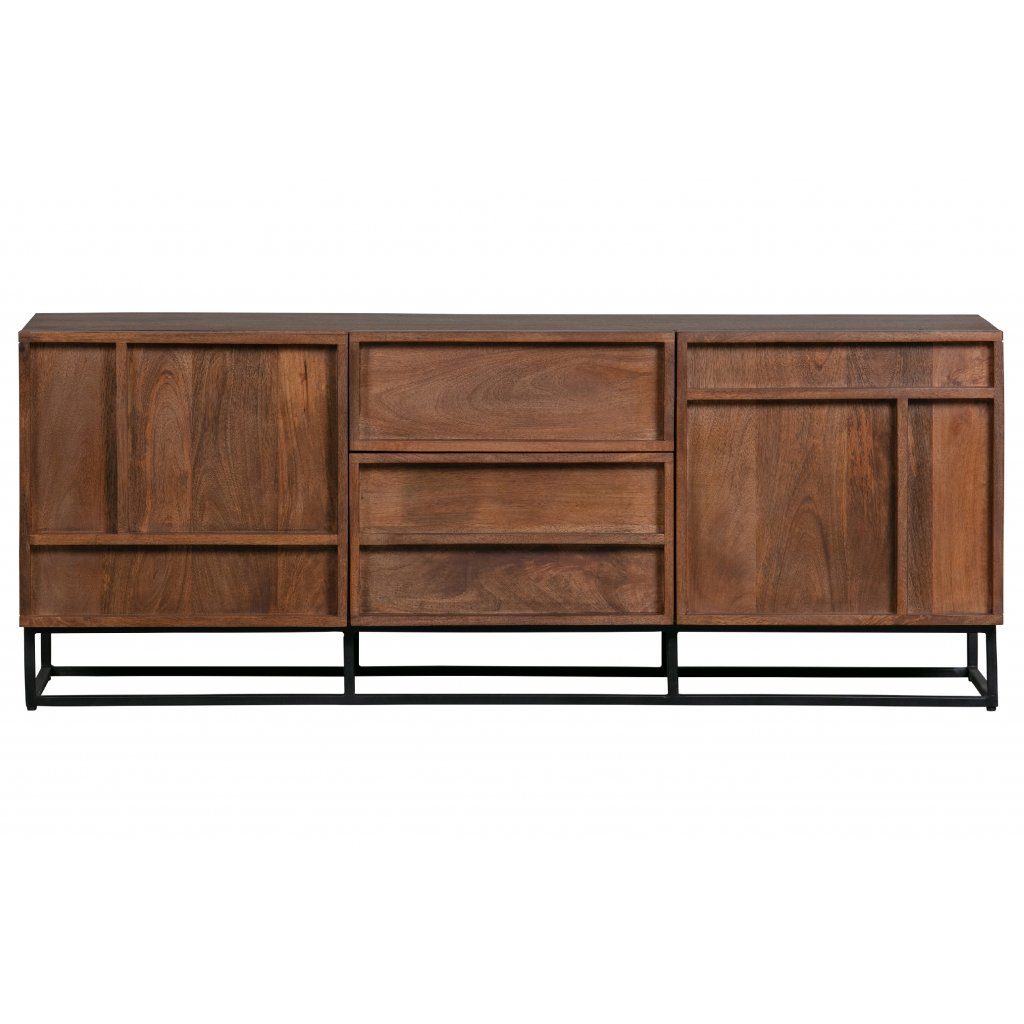 Designový a stylový TV stolek FORREST od holandského výrobce kvalitního nábytku WOOOD. Stolek FORREST má spodní podstavu z černě lakovaného kovu, na niž je posazeno faktické tělo stolku. Tato část je kompletně vyrobena z masivního mangového dřeva v krásné hnědé barvě. Stolek je zajímavý svými rámečky, které z něj dělají vskutku unikátní kus nábytku. Pro uložení vašich věcí vám poslouží 2 výsuvné zásuvky uprostřed a 2 otevírající se dvířka na stranách.