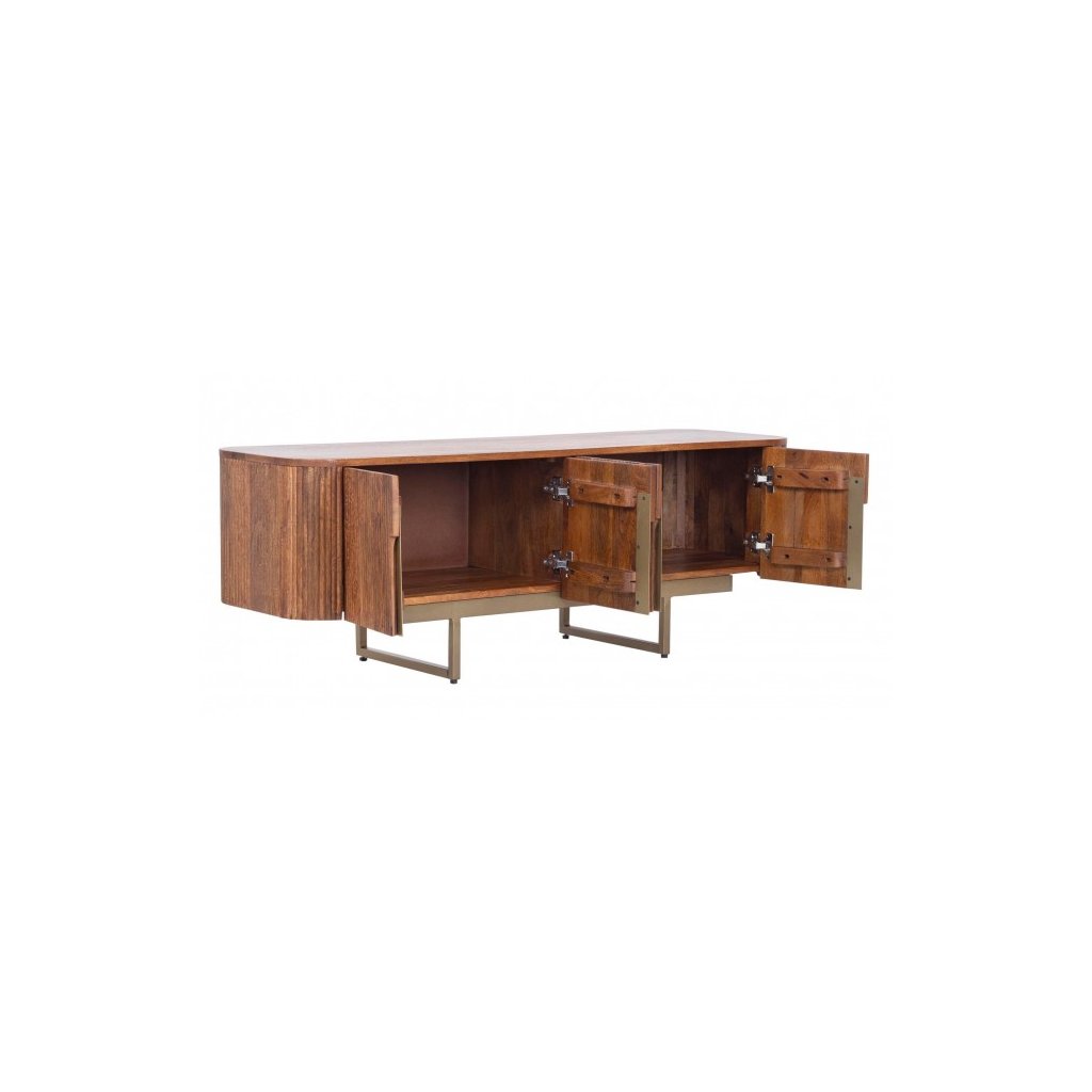 Designový TV stolek VILAS od italského výrobce kvalitního nábytku BIZZOTTO. Tento krásný stolek je vyrobený z mangového dřeva ve hnědé barvě. Obsahuje dvě praktické skříňky a jednu otevřenou poličku na uložení elektroniky s praktickým otvorem na kabeláž na zadní straně. Maximální nosnost a stabilitu zajišťují 4 ocelové nohy ve zlaté barvě.