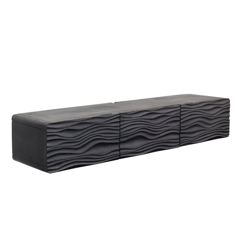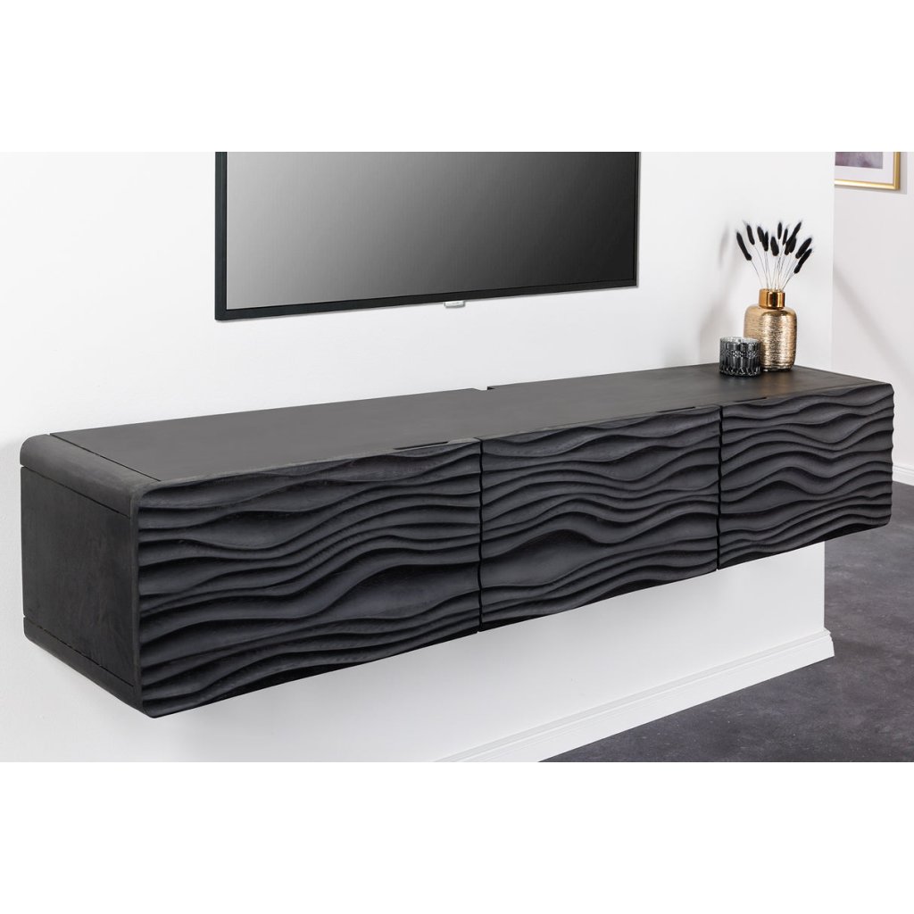 Designový TV stolek WAVE od německé značky designového nábytku INVICTA. Stolek je opravdu nádherný výrobek z masivního dřeva exotického manga v černém laku. Na 3 předních dvířkách najdete jednotlivé vlny v 3D provedení, které z něj dělají unikátní výrobek. Za 3 dvířky pak máte úložný prostor 3 polic na settopbox, konzole a jiné dekorace či dokumenty a techniku. Stolek nemá nohy a je tak určen POUZE na zavěšení na zeď či položení na podlahu.