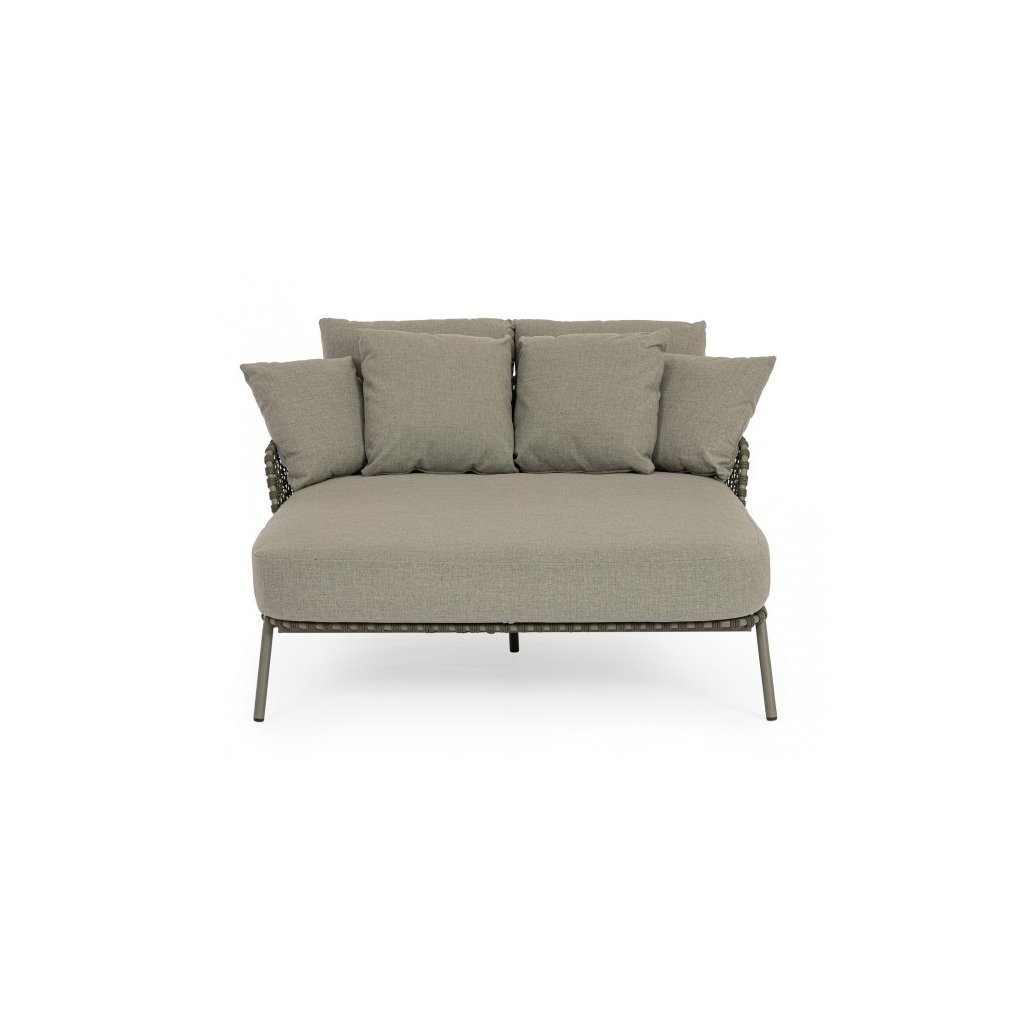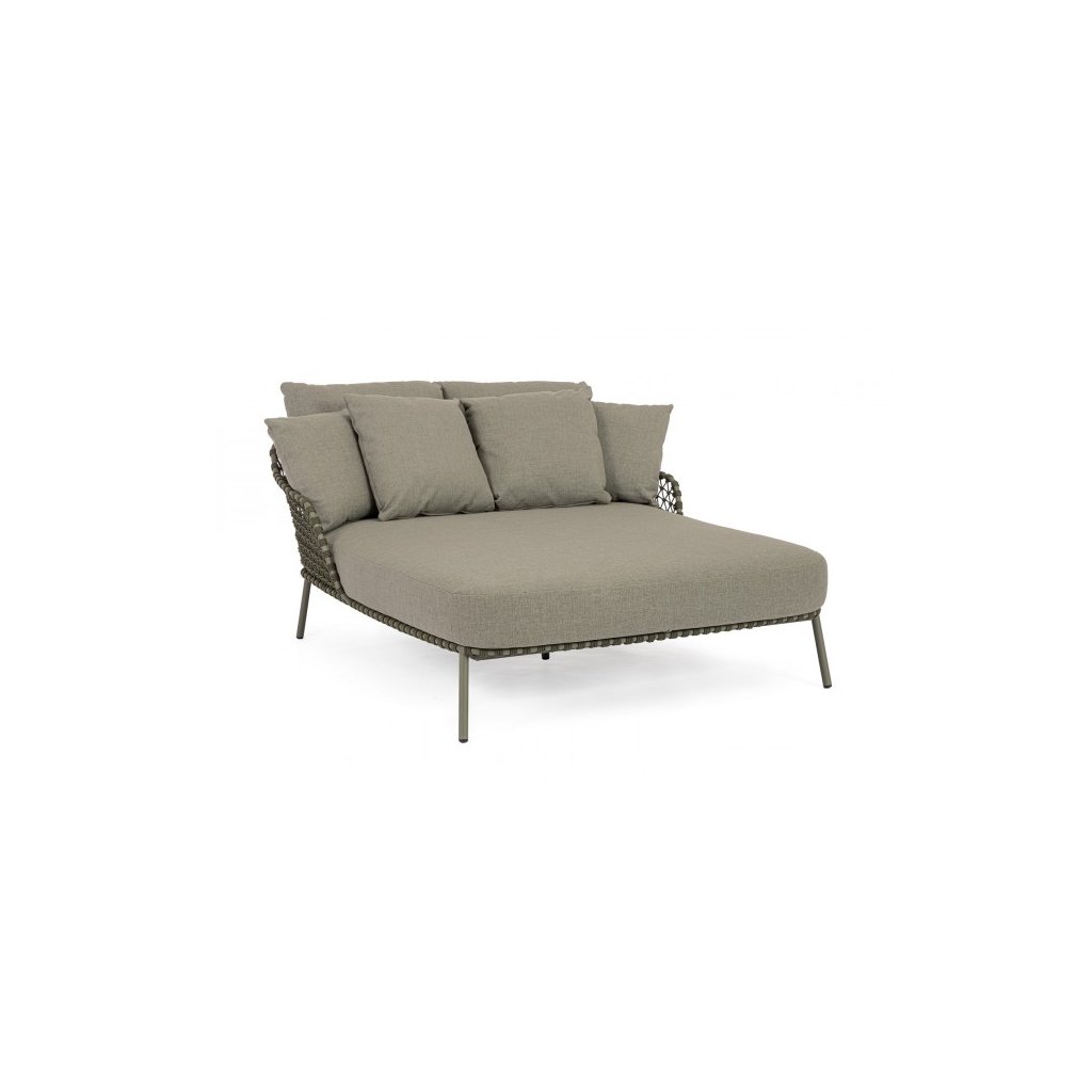 Designové nerezové lehátko pro dva IVISSA od italského výrobce stylového nábytku BIZZOTTO. Lehátko má nerezovou konstrukci, která je částečně potažena lanem z polypropylenu v zelené barvě. Lehátko, nebo také venkovní postel, má vyjímatelné polštáře z voděodolné olefinové látky. Nedoporučuje se vystavovat lehátko přímému slunečnímu záření a extrémním vlivům špatného počasí.