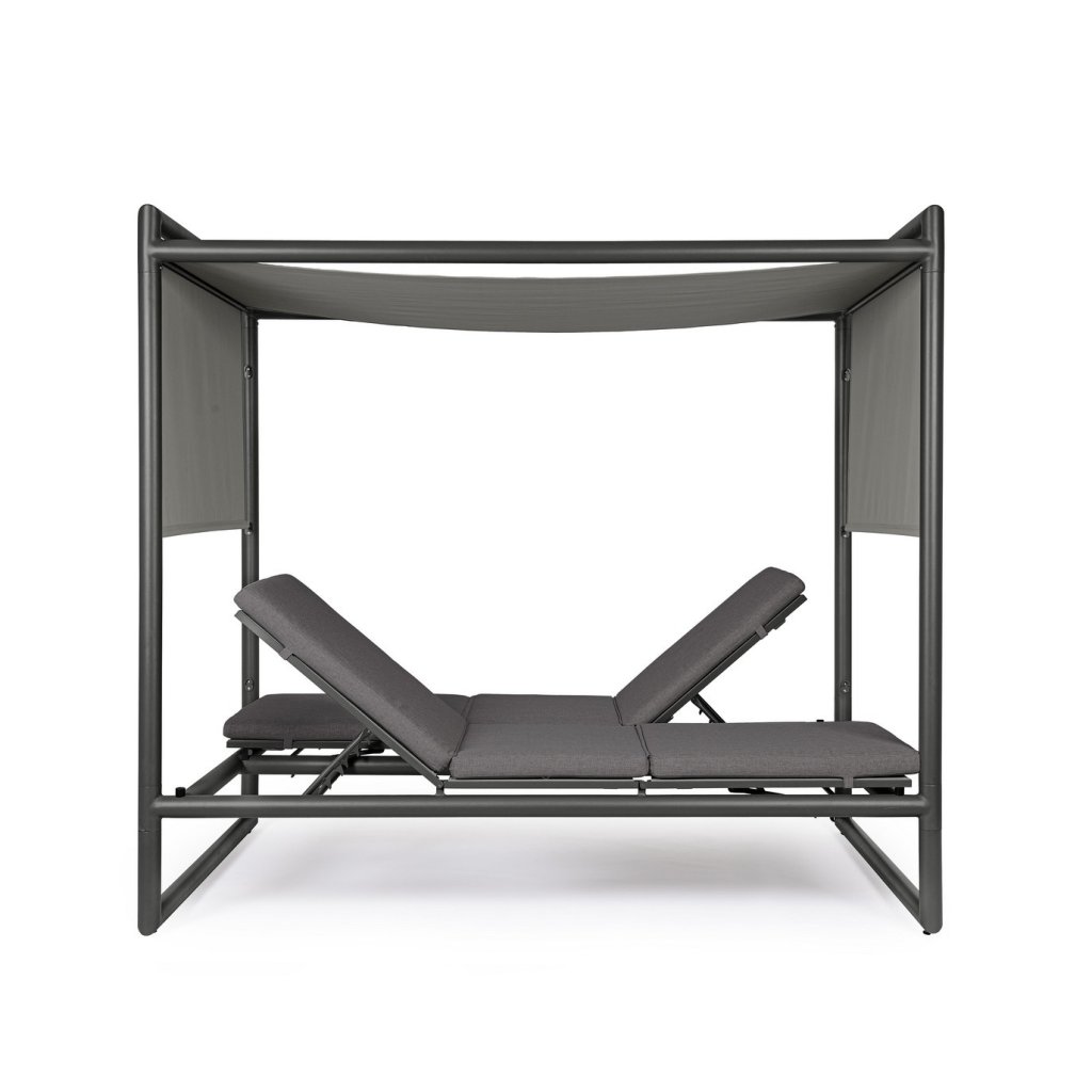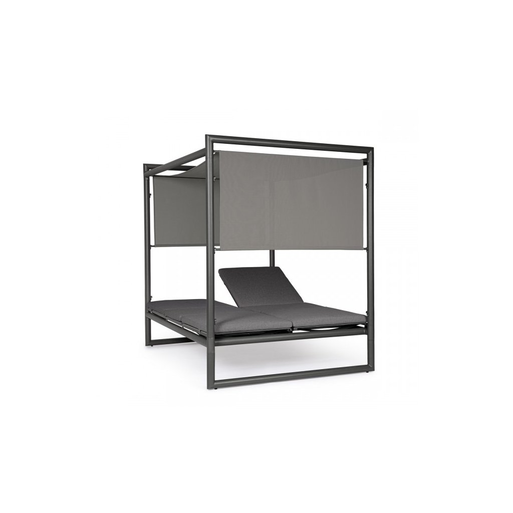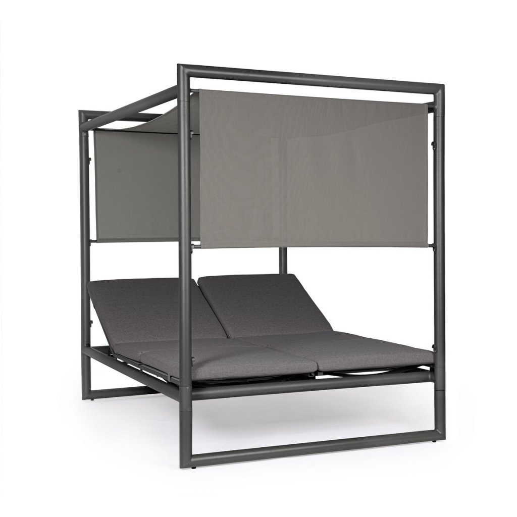 Designové lehátko pro dva KONNOR od italského výrobce stylového nábytku BIZZOTTO. Lehátko se skládá z hliníkového rámu s práškovým nátěrem v antracitové barvě. Textilní židle jsou polohovatelné ve čtyřech polohách. Lehátko, nebo také venkovní postel, má vyjímatelné polštáře z voděodolné olefinové látky. Velkou výhodou lehátka KONNOR je textilní sluneční stříška, která je posuvná do tří pozic. Nedoporučuje se vystavovat lehátko přímému slunečnímu záření a extrémním vlivům špatného počasí.