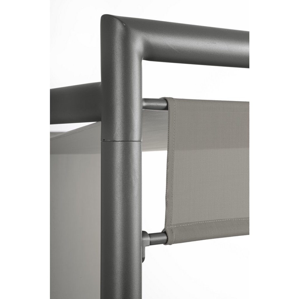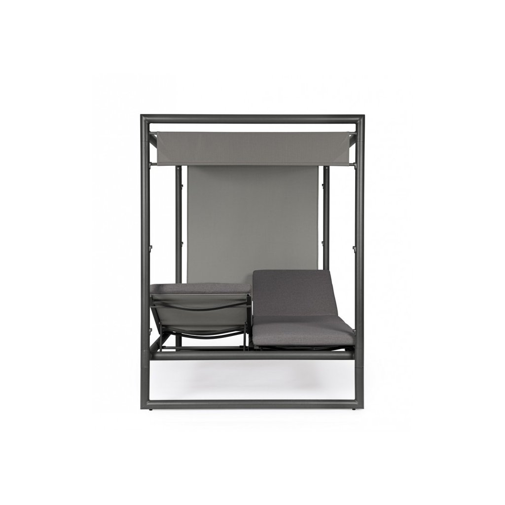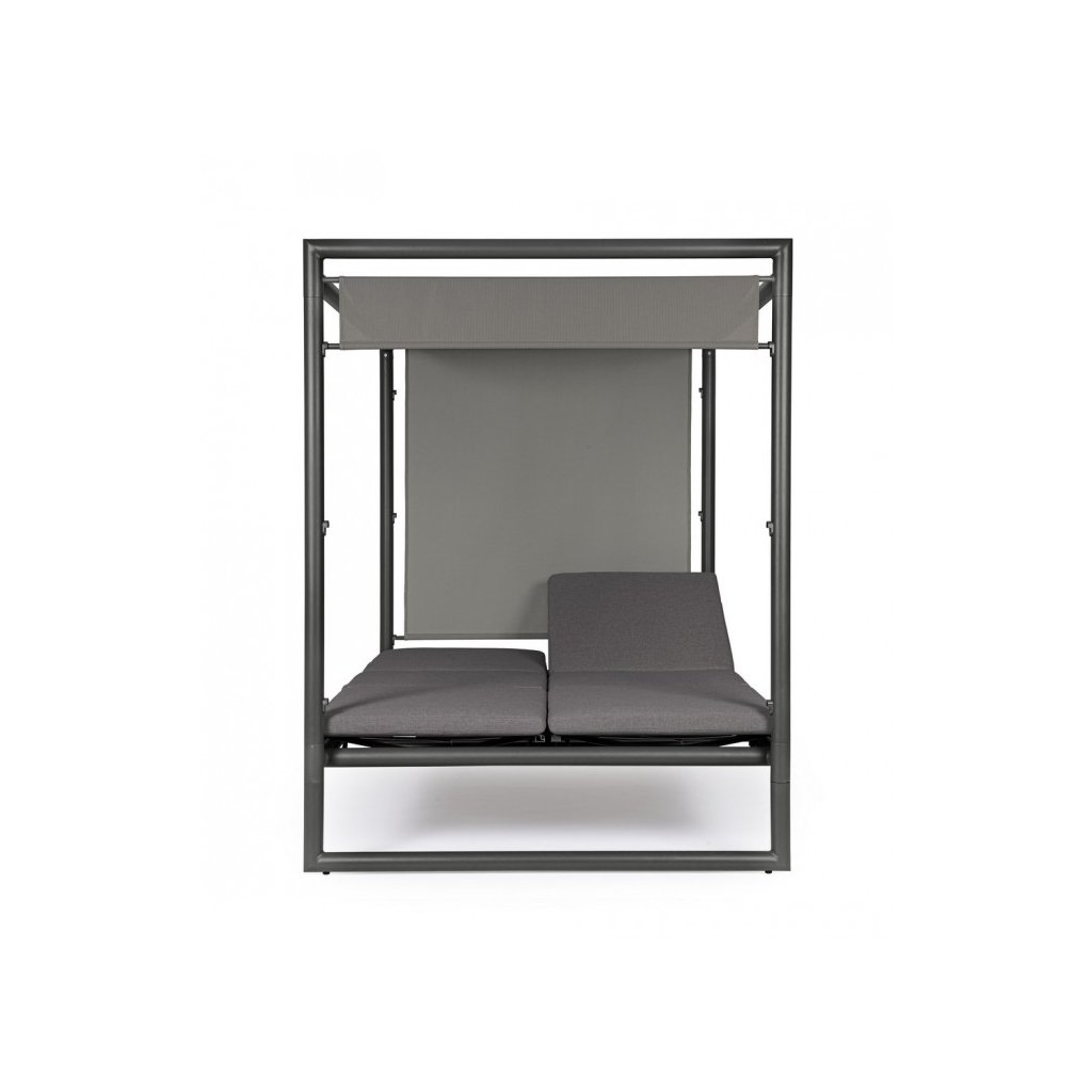 Designové lehátko pro dva KONNOR od italského výrobce stylového nábytku BIZZOTTO. Lehátko se skládá z hliníkového rámu s práškovým nátěrem v antracitové barvě. Textilní židle jsou polohovatelné ve čtyřech polohách. Lehátko, nebo také venkovní postel, má vyjímatelné polštáře z voděodolné olefinové látky. Velkou výhodou lehátka KONNOR je textilní sluneční stříška, která je posuvná do tří pozic. Nedoporučuje se vystavovat lehátko přímému slunečnímu záření a extrémním vlivům špatného počasí.