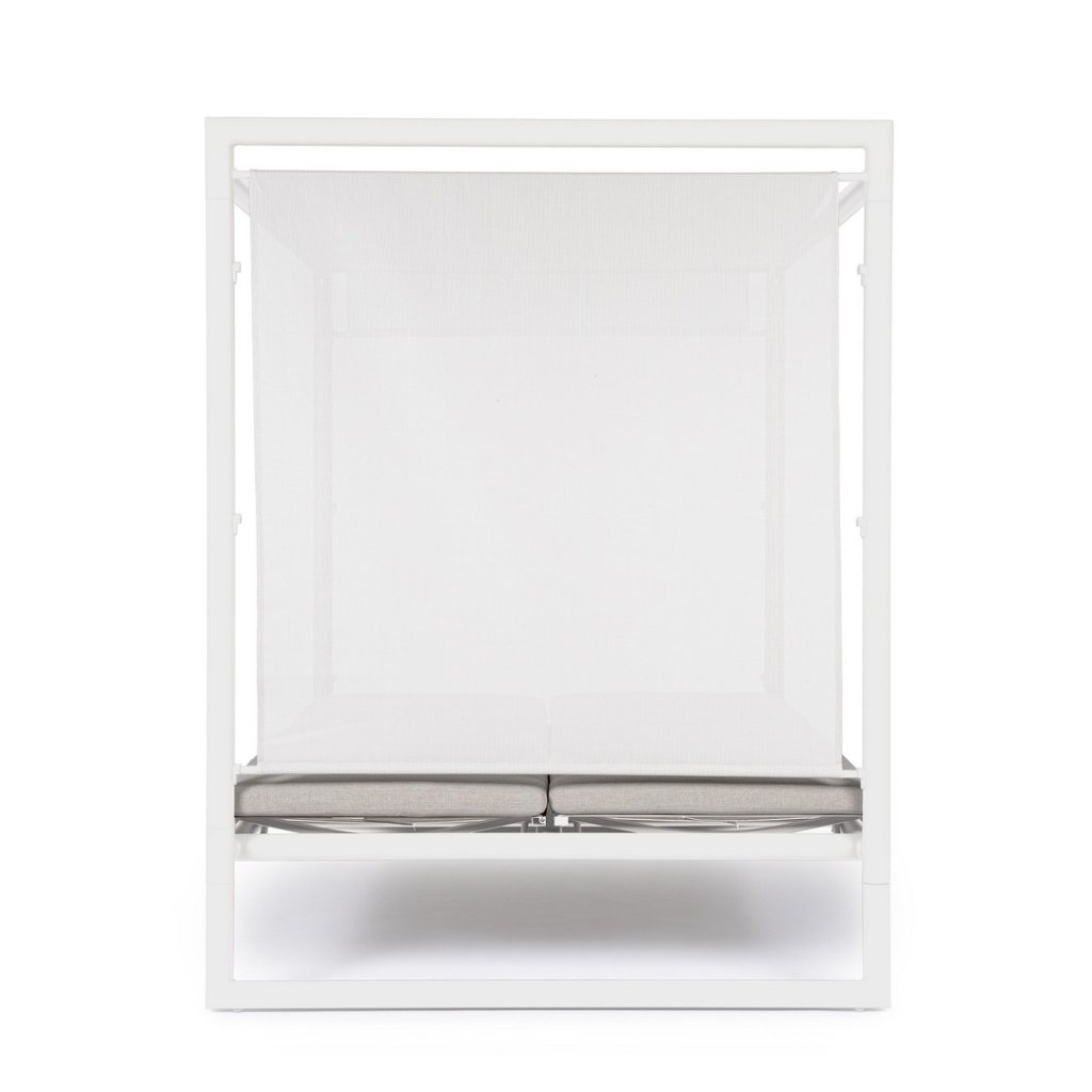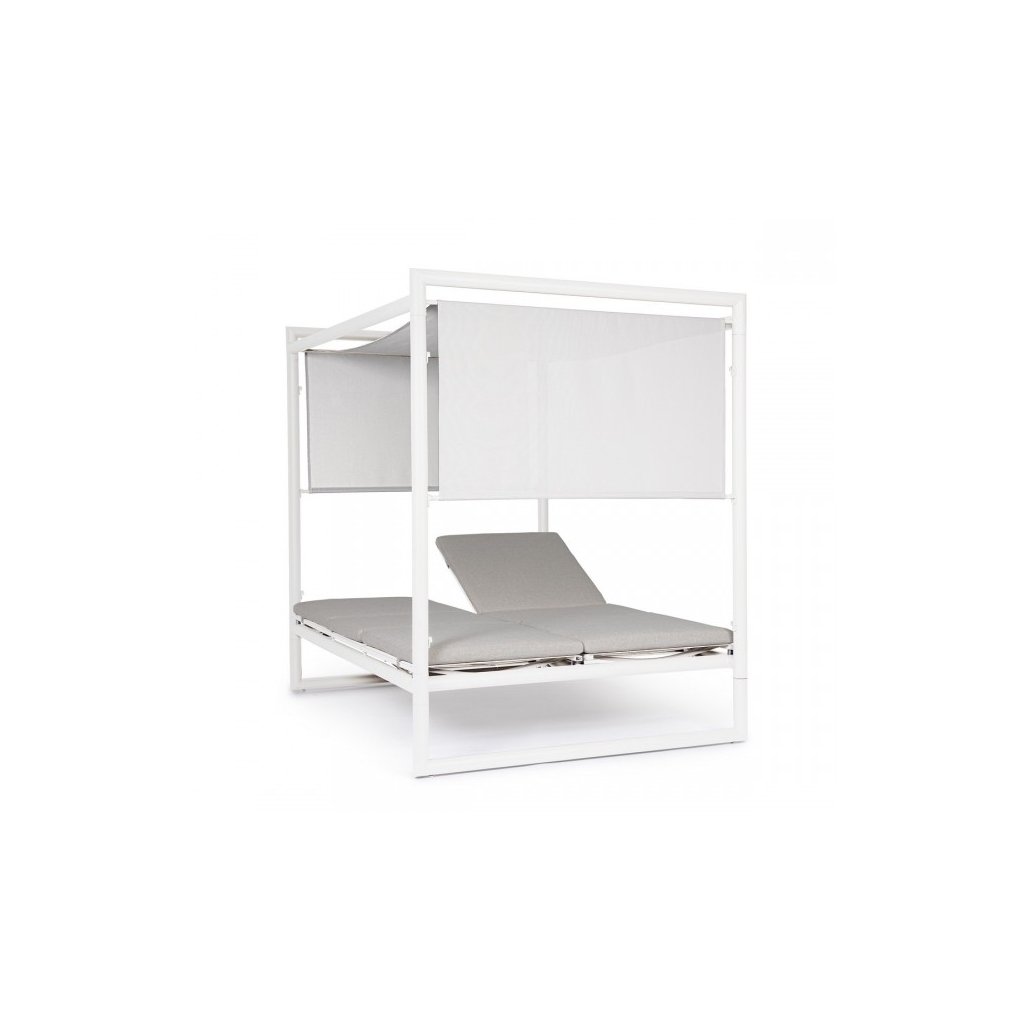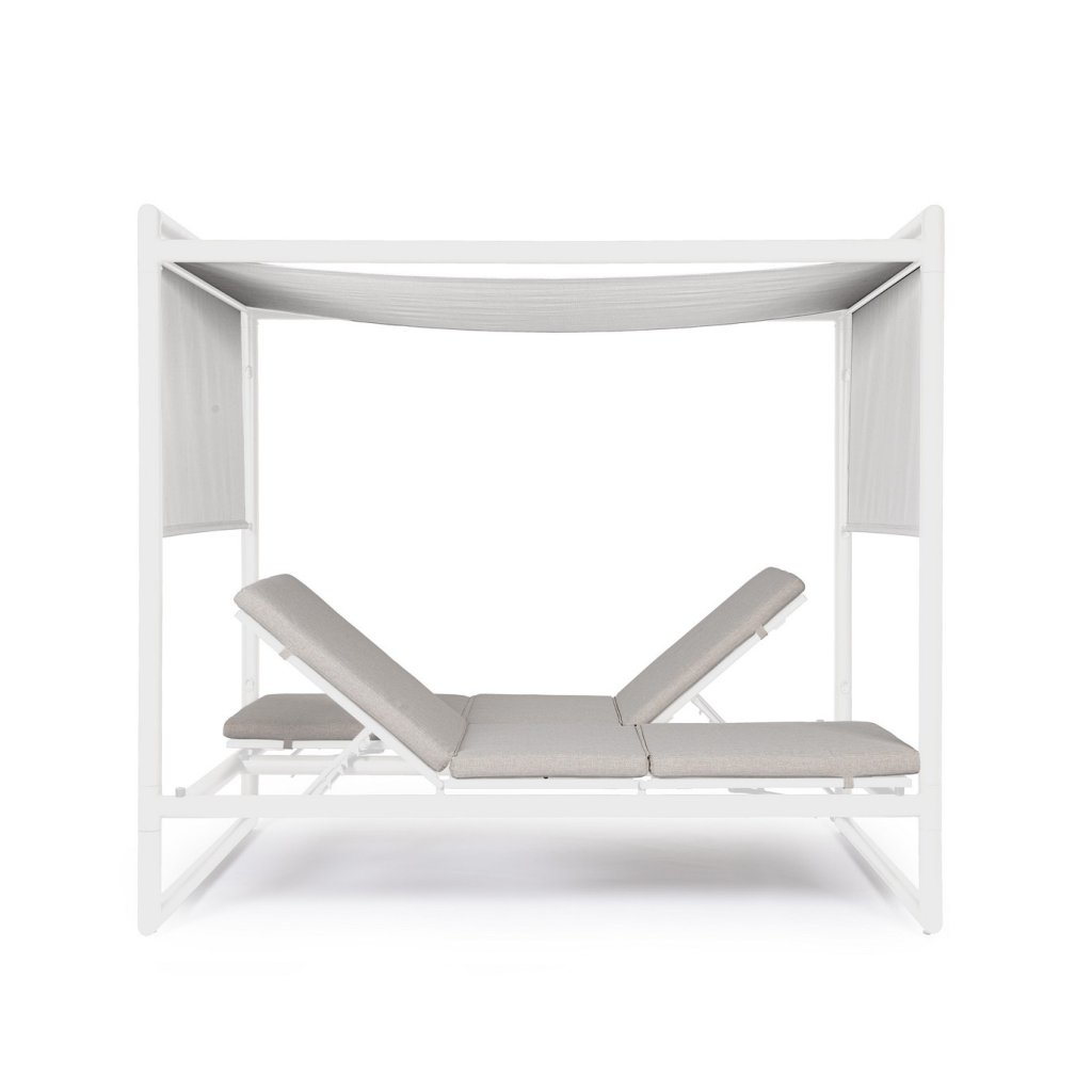 Designové lehátko pro dva KONNOR od italského výrobce stylového nábytku BIZZOTTO. Lehátko se skládá z hliníkového rámu s práškovým nátěrem v bílé barvě. Textilní židle jsou polohovatelné ve čtyřech polohách. Lehátko, nebo také venkovní postel, má vyjímatelné polštáře z voděodolné olefinové látky. Velkou výhodou lehátka KONNOR je textilní sluneční stříška, která je posuvná do tří pozic. Nedoporučuje se vystavovat lehátko přímému slunečnímu záření a extrémním vlivům špatného počasí.