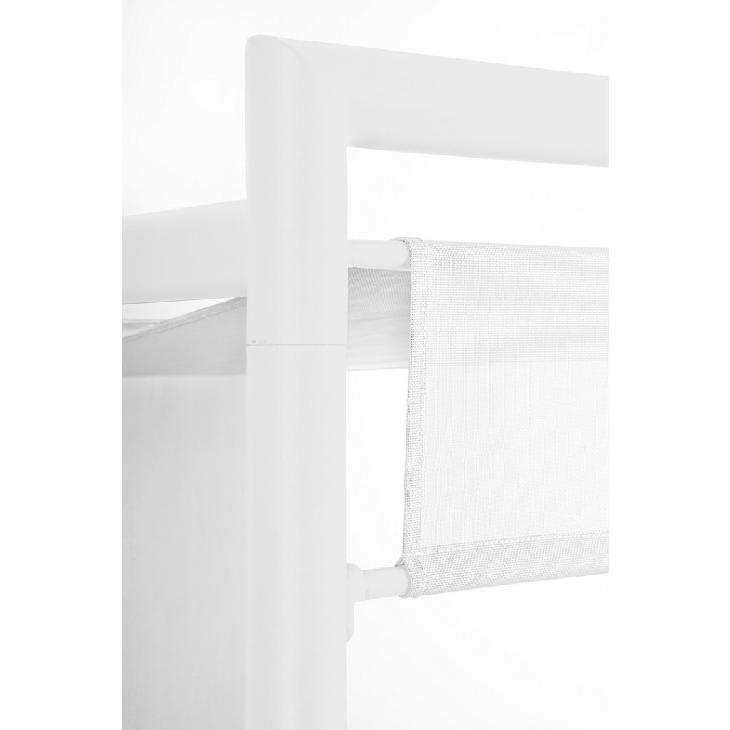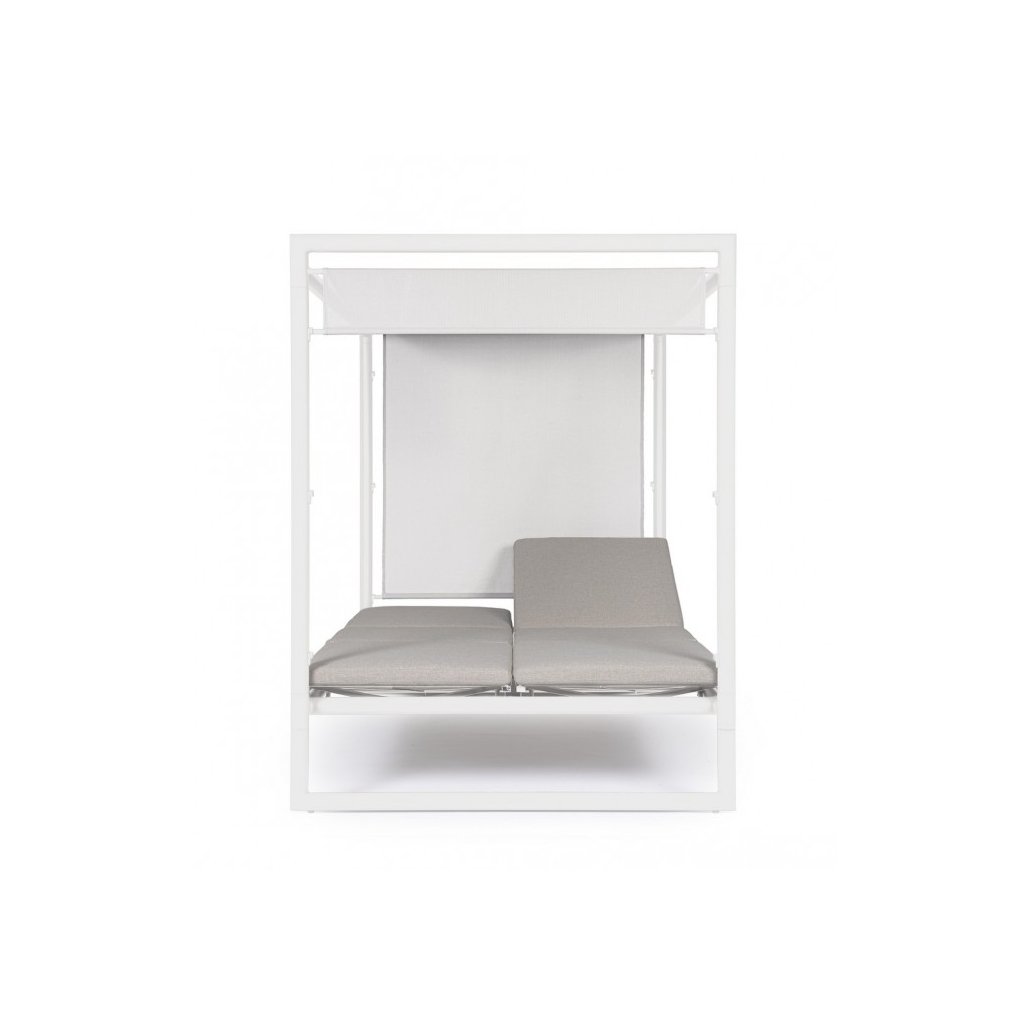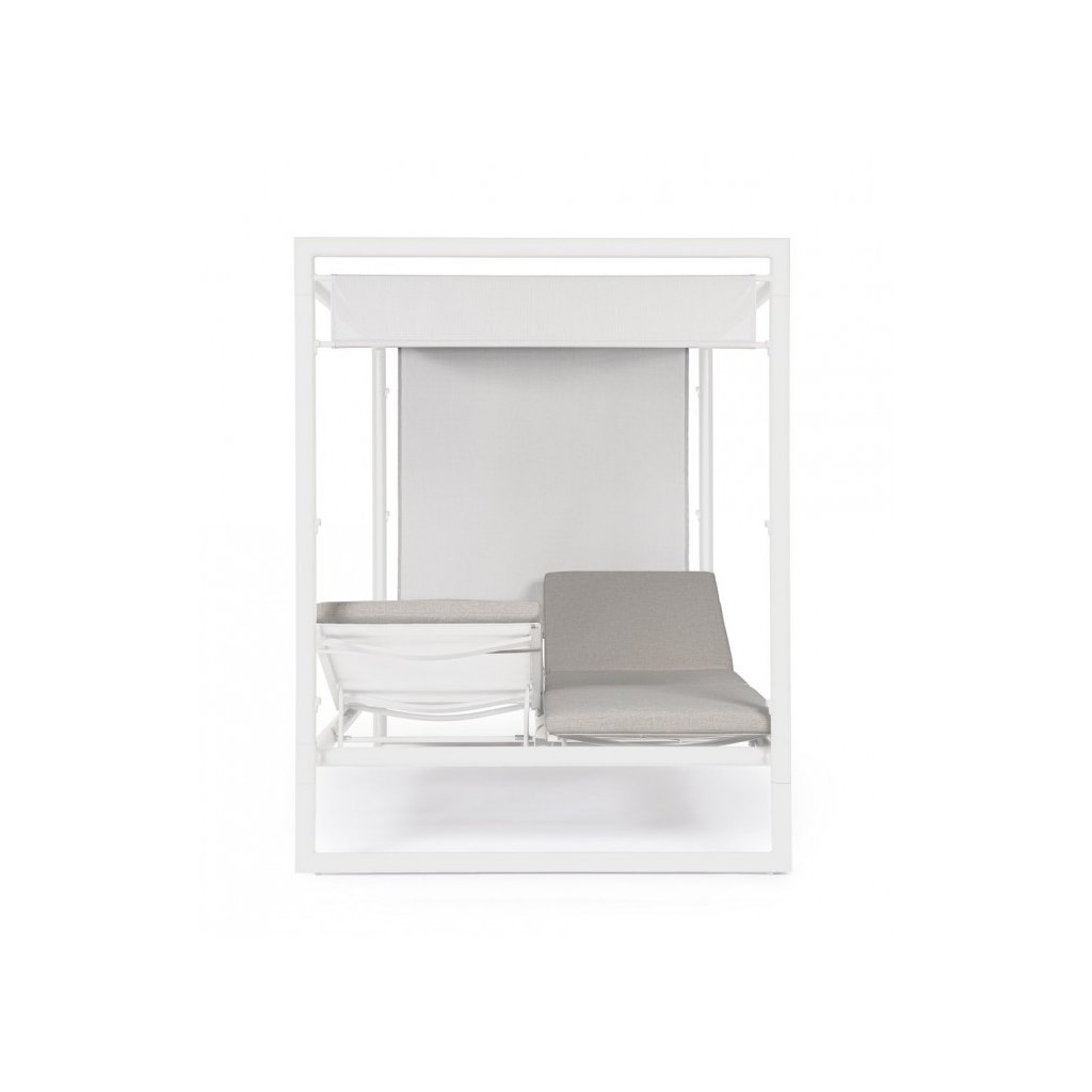 Designové lehátko pro dva KONNOR od italského výrobce stylového nábytku BIZZOTTO. Lehátko se skládá z hliníkového rámu s práškovým nátěrem v bílé barvě. Textilní židle jsou polohovatelné ve čtyřech polohách. Lehátko, nebo také venkovní postel, má vyjímatelné polštáře z voděodolné olefinové látky. Velkou výhodou lehátka KONNOR je textilní sluneční stříška, která je posuvná do tří pozic. Nedoporučuje se vystavovat lehátko přímému slunečnímu záření a extrémním vlivům špatného počasí.