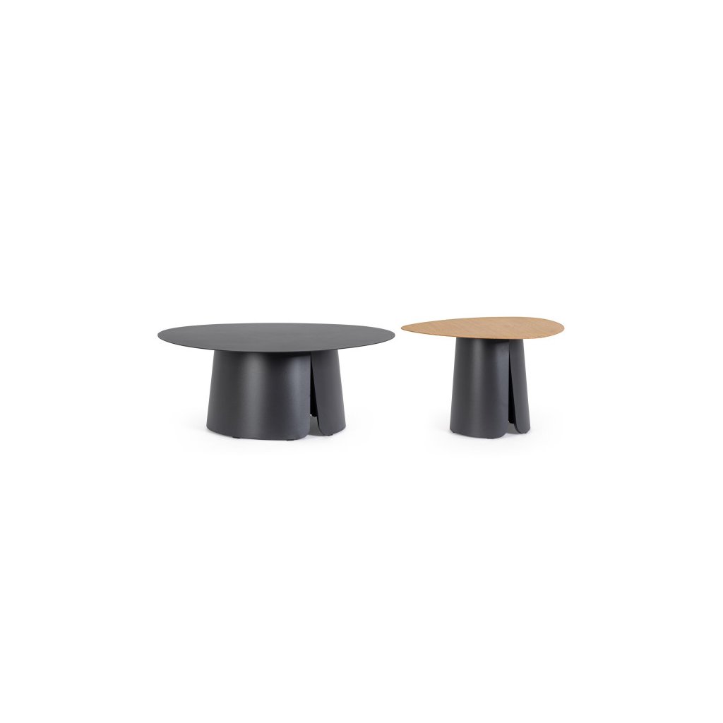 Zahradní set kulatých konferenčních stolků HAYDEN od italského výrobce stylového nábytku BIZZOTTO. Stolky HAYDEN jsou kompletně vyrobeny z práškovaného hliníku, většinově v antracitovém provedení krom desky menšího stolku, který má efekt světlého dřeva a organický tvar. Stolky se doplňují velikostí a vytvářejí krásný pár. Pevná noha se zajímavým designem zajišťuje stolkům stabilitu.