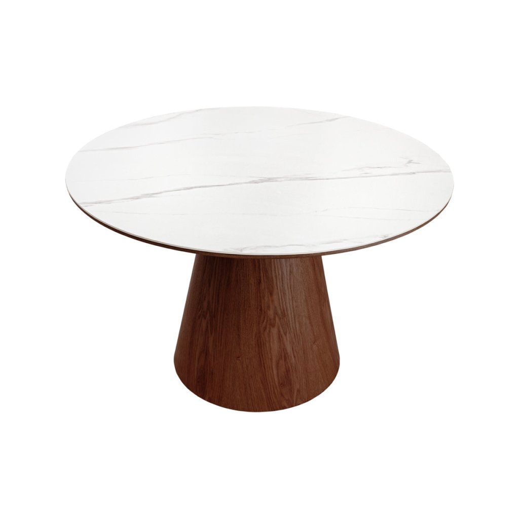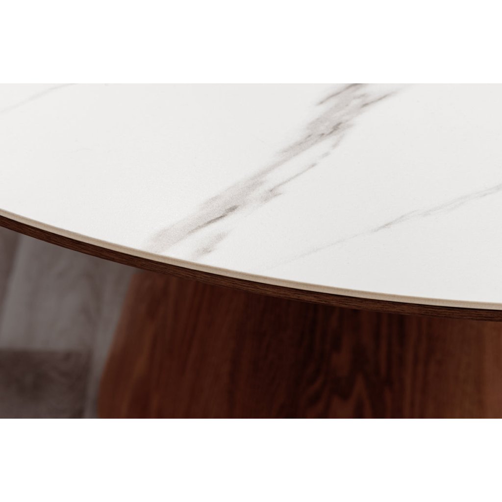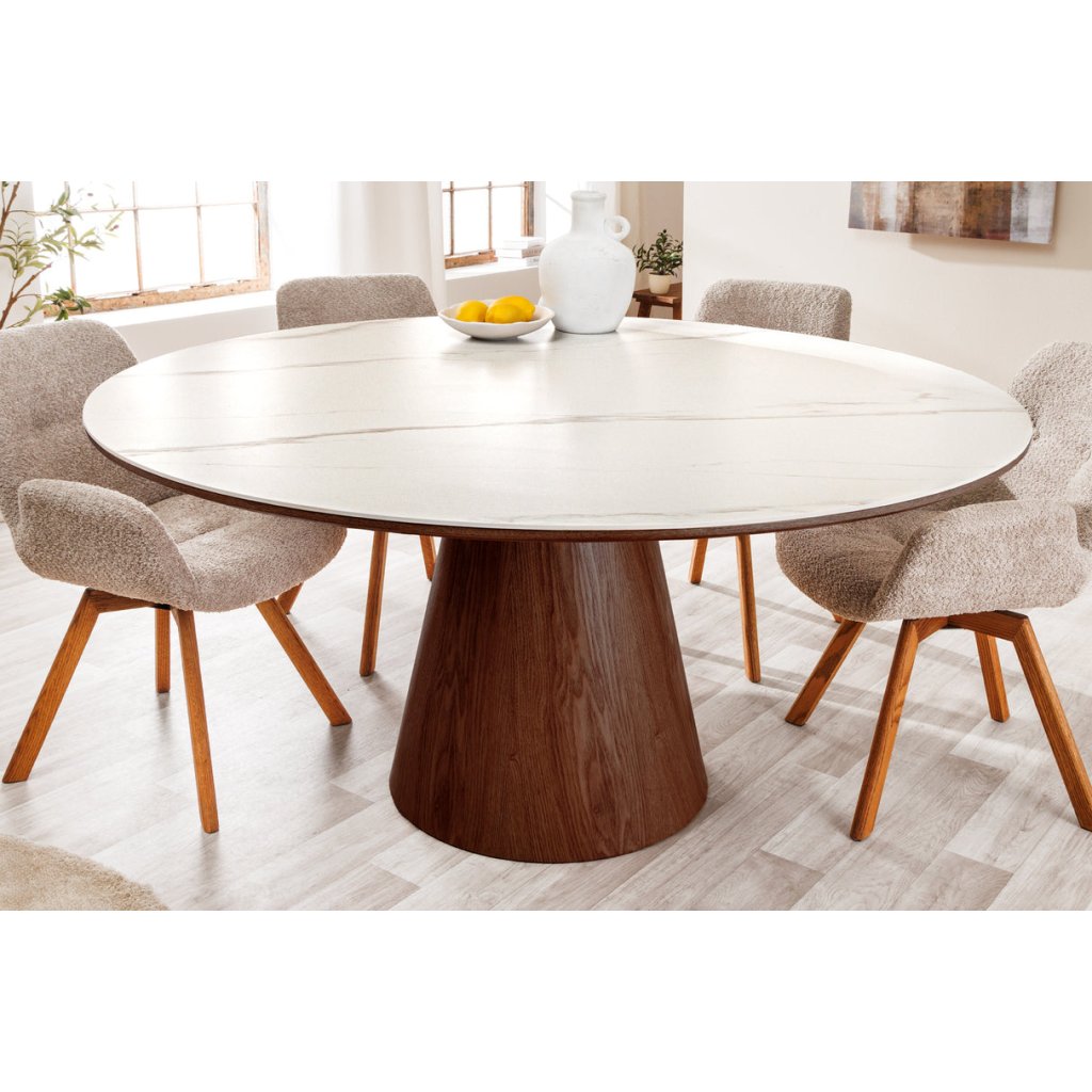 Designový kulatý jídelní stůl UNIQUE od německé značky krásného nábytku INVICTA. Kulatý stůl s keramickou deskou v kombinaci bílé a hnědé barvy je elegantním a funkčním doplňkem moderního interiéru. Základna stolu je vyrobena z kombinace MDF , kaštanové dýhy v hnědé barvy a keramické desky v provedení bílého mramoru. Válcovitá dřevěná noha zajišťuje stabilitu a podtrhuje nadčasový design. Díky praktickému kulatému tvaru o průměru 120 cm je stolek ideální vaší jídelny či kuchyně.