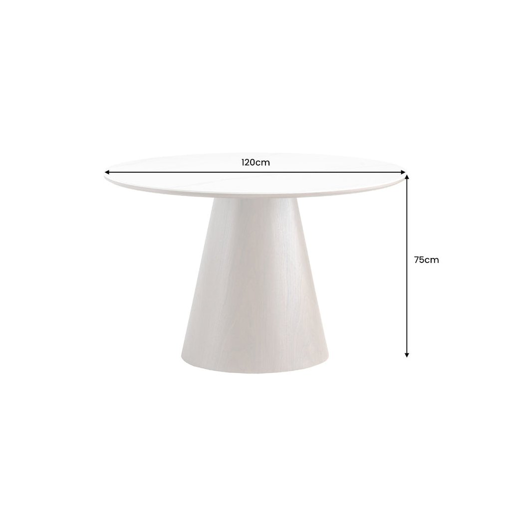 Tento stůl se perfektně hodí do moderních, skandinávských i minimalistických interiérů, kde vynikne jeho čistý kulatý tvar a elegantní barevná kombinace. Skvěle ladí s židlemi v přírodních tónech, s černými, šedými nebo dřevěnými prvky. Díky keramickému povrchu působí luxusně, ale zároveň prakticky. Je ideální pro každodenní použití i slavnostní chvíle. Vynikne ve světlých prostorech i v kontrastu s tmavší podlahou.