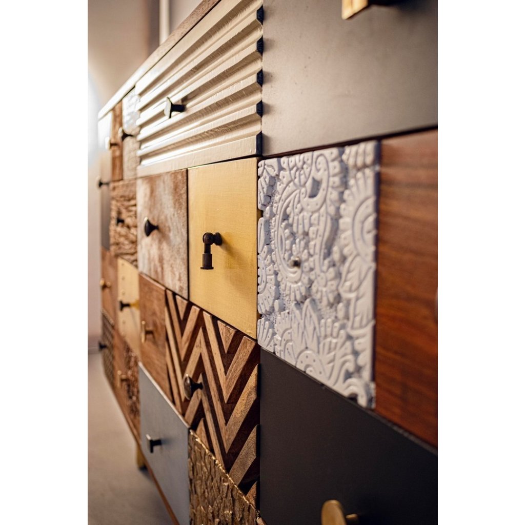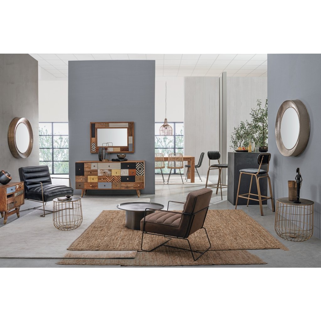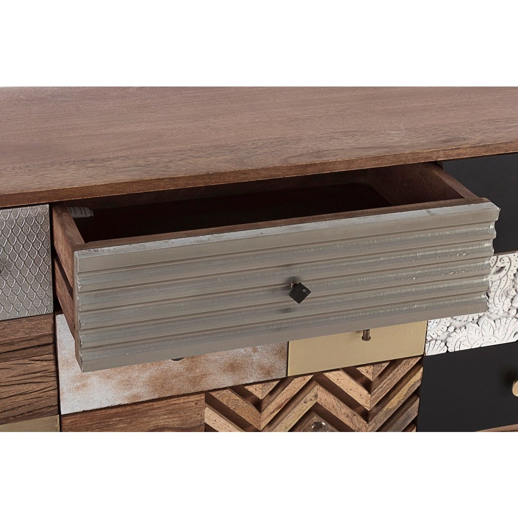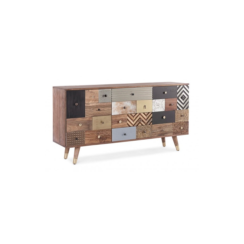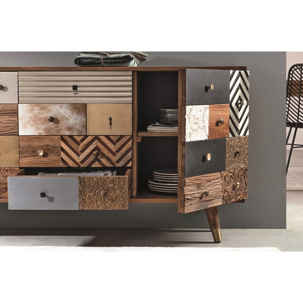 Designový příborník DHAVAL od italského výrobce stylového nábytku BIZZOTTO. Příborník v moderním stylu je vyroben především z velmi kvalitního mangového dřeva. Zadní strana je z mdf desky ve stejné barvě. Díky 4 zásuvkám, 2 skříňkám je příborník velmi prostorný. Příborník je charakteristický svou skladbou předních desek, které jsou vyrobeny z mangového a akáciového dřeva s aplikacemi z kovu a kůže. Skvělou stabilitu zajišťují 4 dřevěné nohy. Úložný prostor otevřete kovovými úchyty. Dřevěný příborník zaujme především svým netradičním provedením a prostorností. Příborník krásně zapadne do moderních i klasických interiérů.