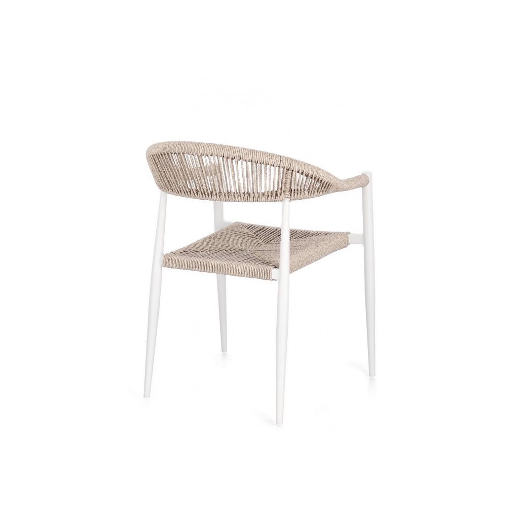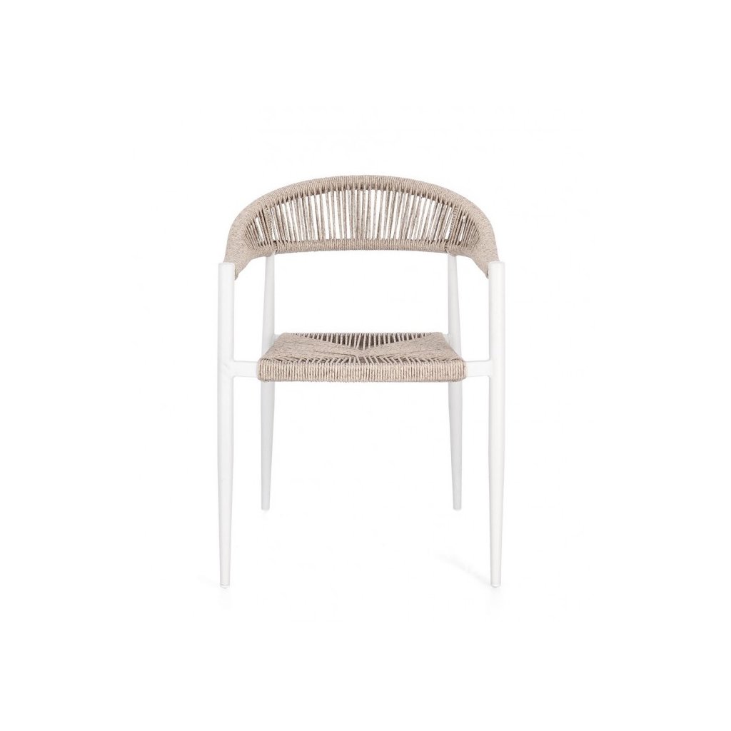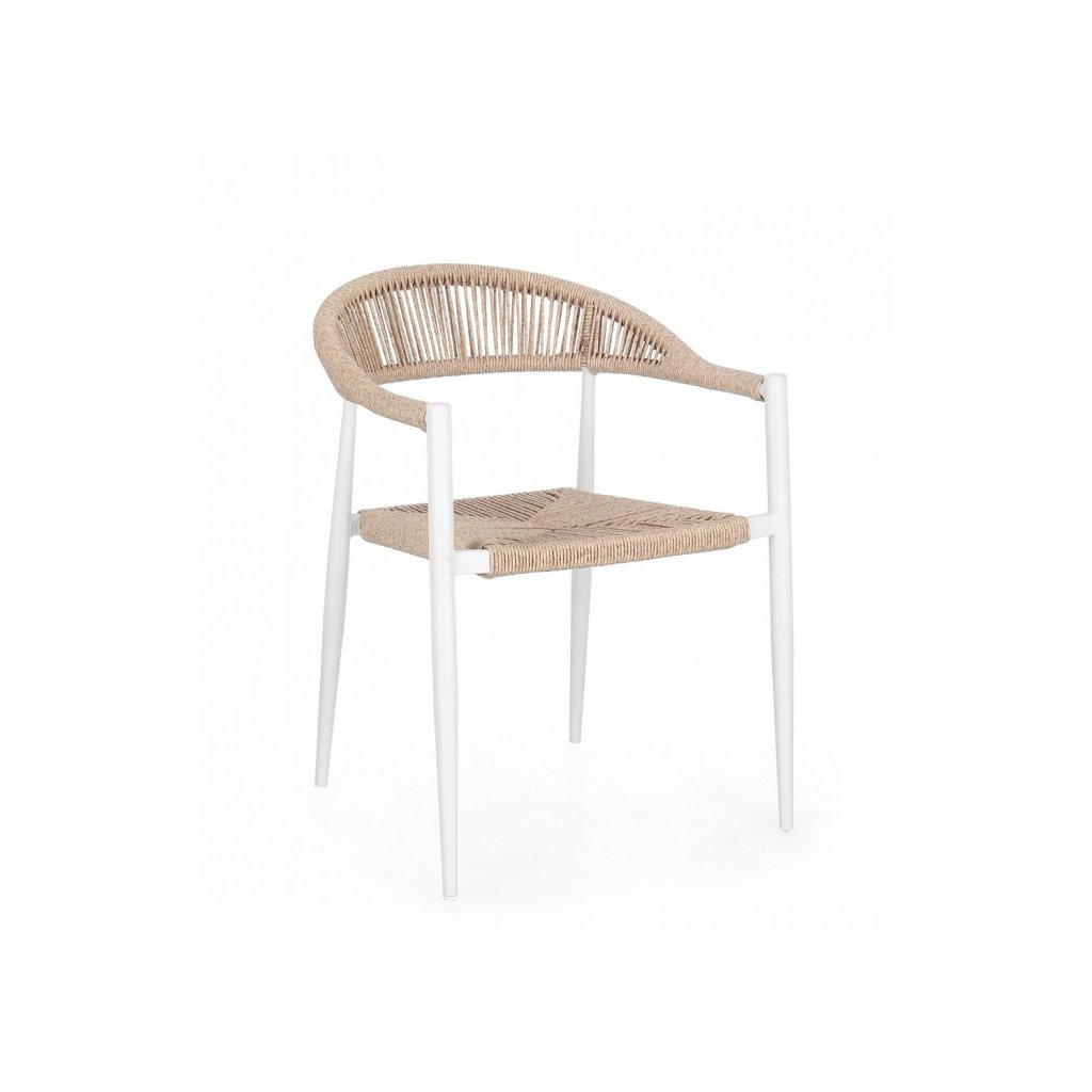 Designová zahradní židle JANDIA od italského výrobce stylového nábytku BIZZOTTO.  Židle JANDIA je dodávána s konstrukcí z práškovaného hliníku v bílé barvě.  Sedák a zadní opěrka je tvořena hlavně výpletem ze syntetického vlákna v béžové barvě.  Sedadlo židle se pak pyšní vodotěsným polstrováním z polyesteru. Díky odolnému materiálu je možné využít jak uvnitř, tak i venku.
