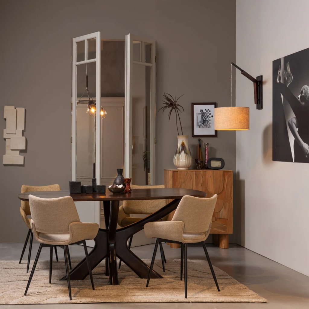 Stylový a krásný jídelní stůl BRIDGE od holandského výrobce kvalitního nábytku WOOOD. Tento krásný jídelní stůl je kompletně vyroben z mangového dřeva v tmavě hnědé barvě. Vrchní část stolu tvoří oválná jídelní deska s rozměry 180x100 cm. Příčná noha dodává stolu robustní design. Toto provedení zároveň poskytuje prostor pro volné sezení u okrajů stolu, což je velmi praktické.
