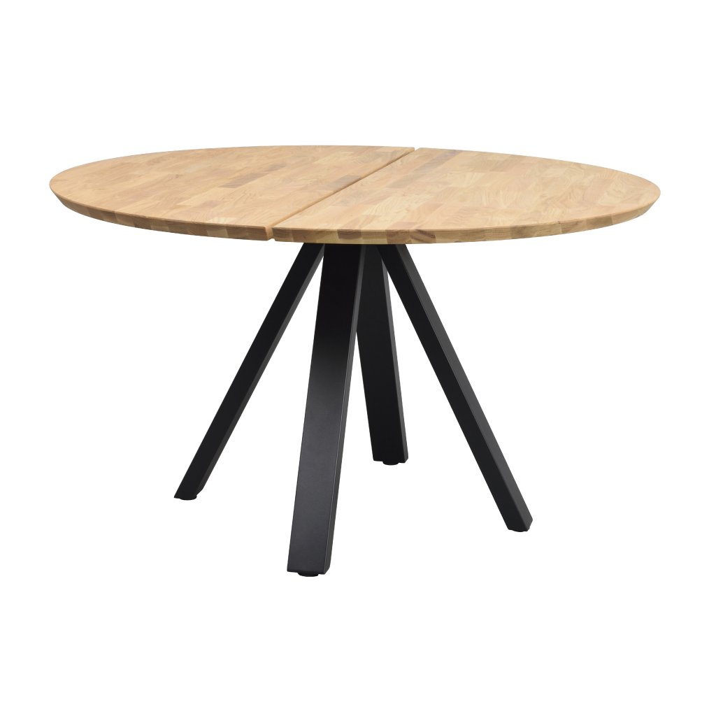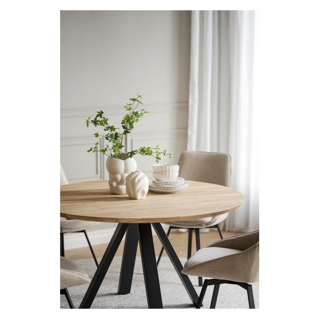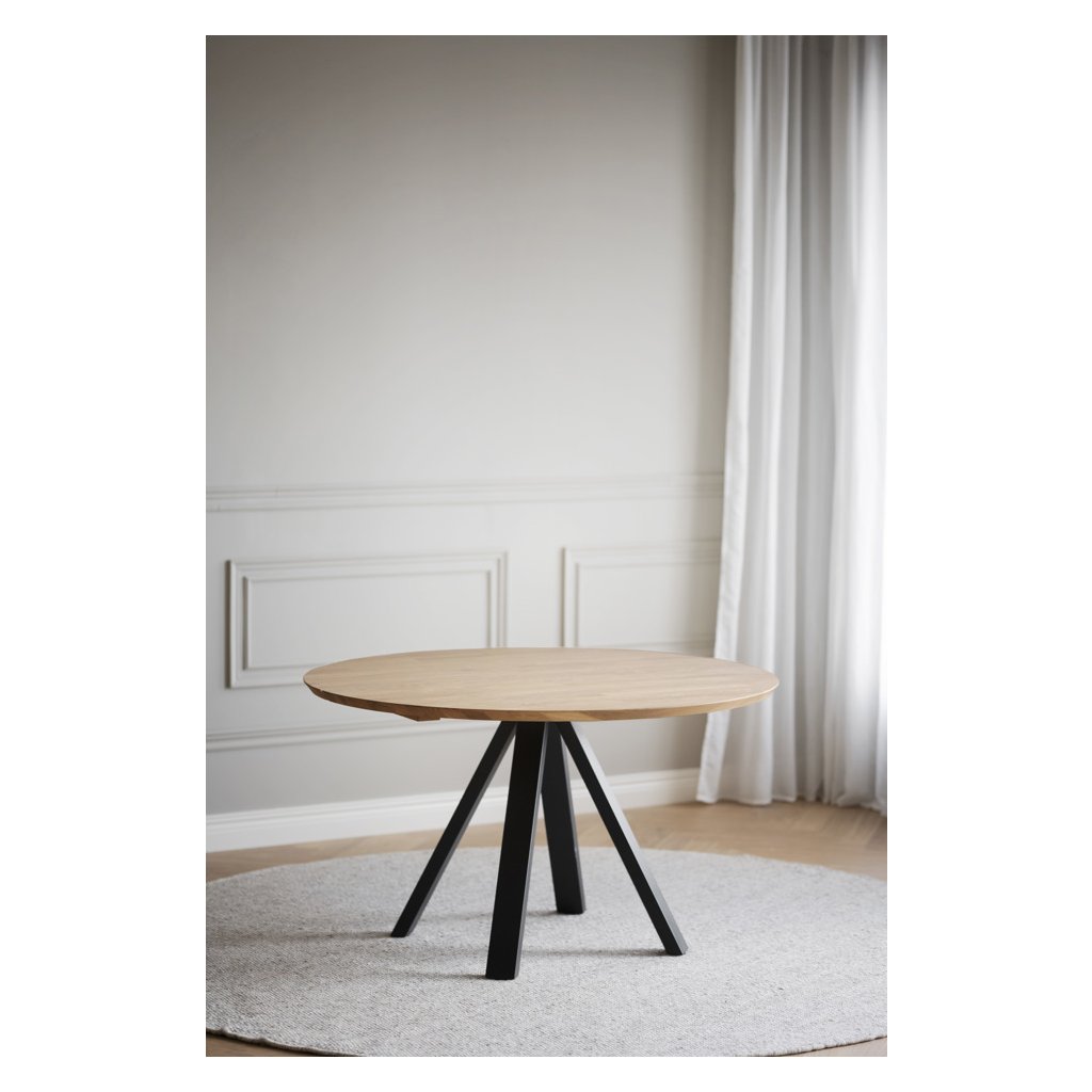 Kulatý jídelní stůl CARRADALE od švédského výrobce designového nábytku ROWICO. Stůl CARRADALE tvoří černě lakované kovové nohy, které zajišťují maximální stabilitu, nosnost a pevnost. Kulatá deska stolu je ze 2 částí masivního dubového dřeva ve světle hnědém provedení. Deska má průměr 130 centimetrů. Stylový kulatý stůl udělá velkou parádu zejména v menších prostorech. Stůl má certifikát FSC, což značí ekologicky získané dřevo.
