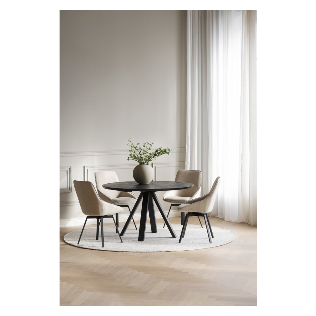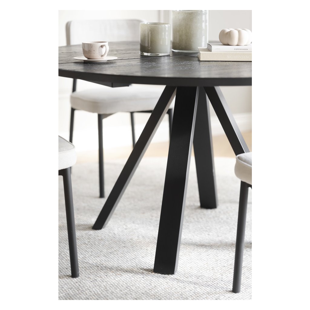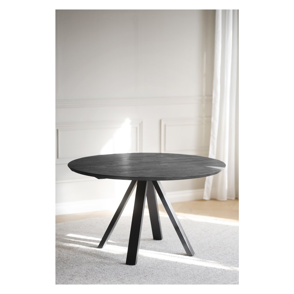 Kulatý jídelní stůl CARRADALE od švédského výrobce designového nábytku ROWICO. Stůl CARRADALE tvoří černě lakované kovové nohy, které zajišťují maximální stabilitu, nosnost a pevnost. Kulatá deska stolu je ze 2 částí masivního dubového dřeva v černém provedení. Deska má průměr 130 centimetrů. Stylový kulatý stůl udělá velkou parádu zejména v menších prostorech. Stůl má certifikát FSC, což značí ekologicky získané dřevo.