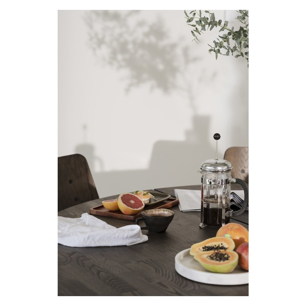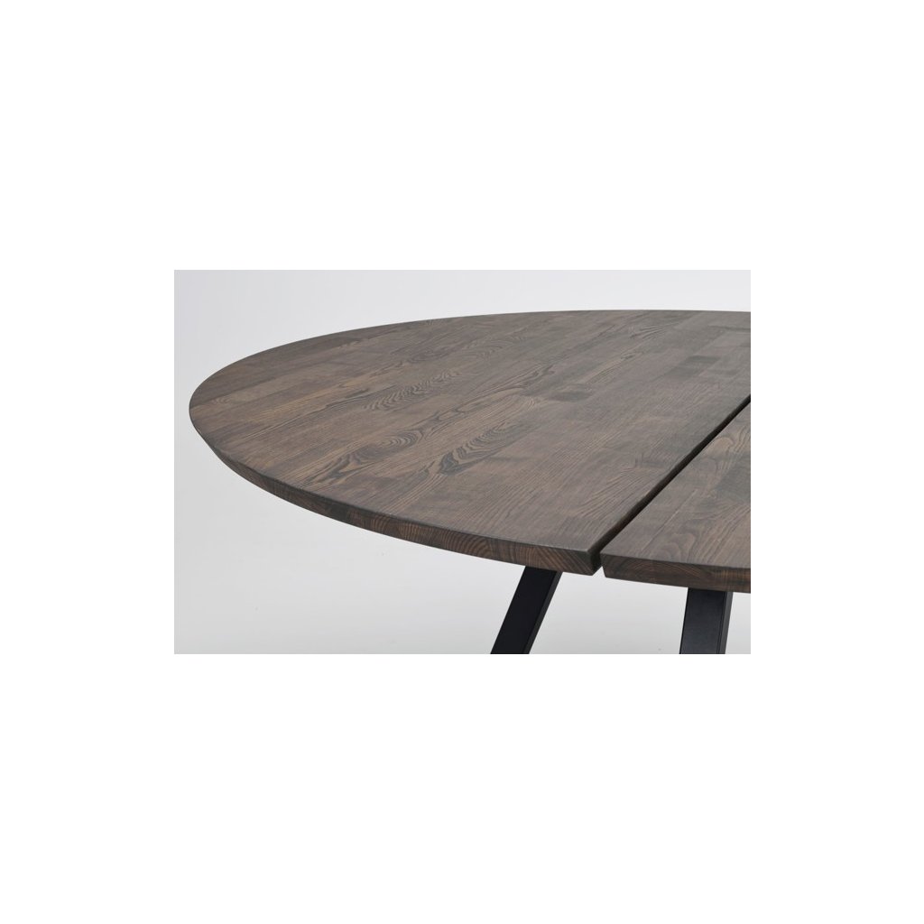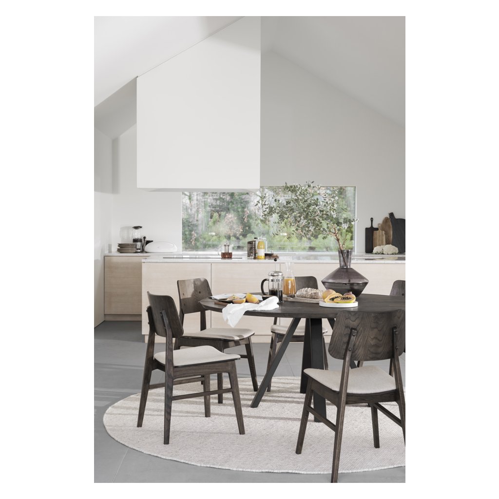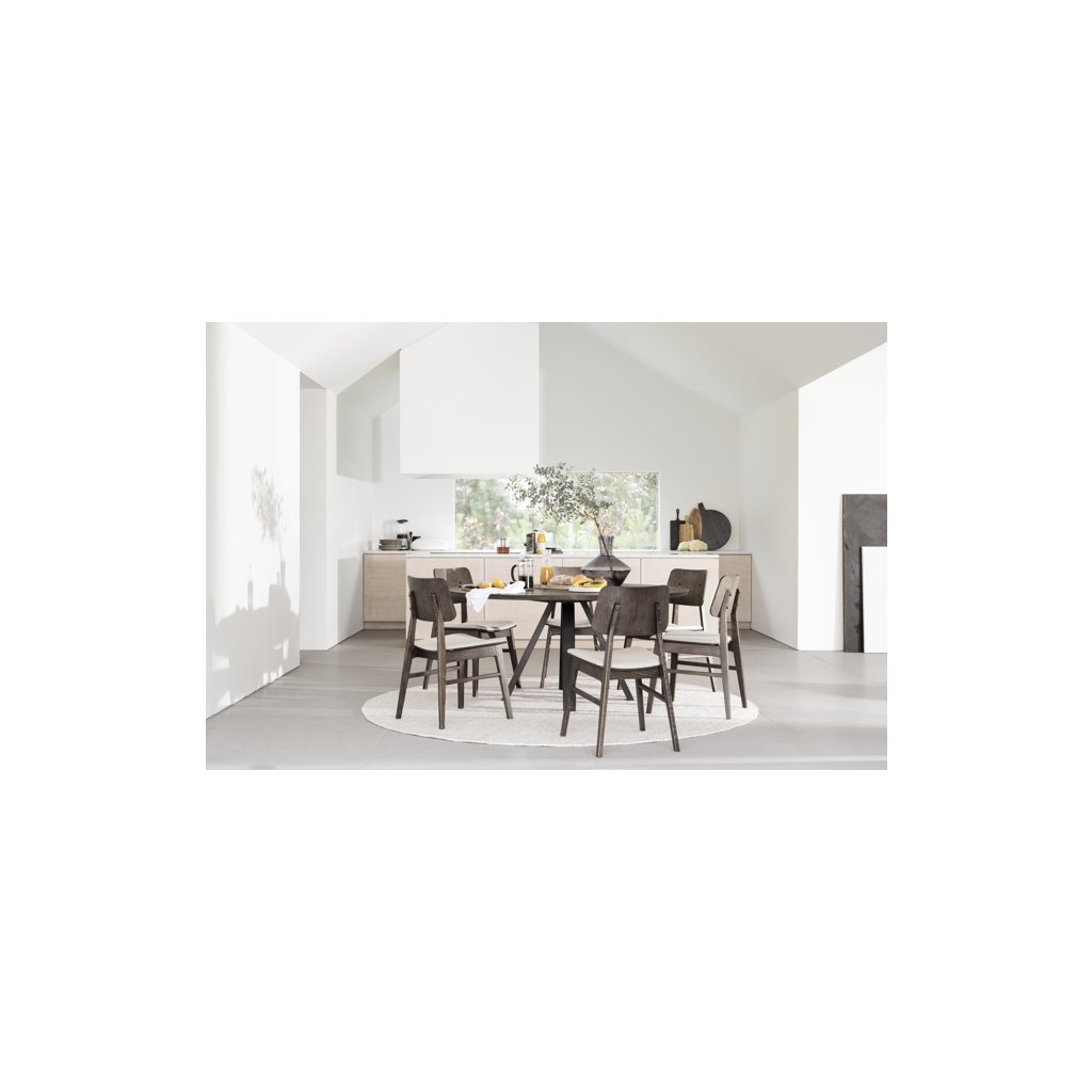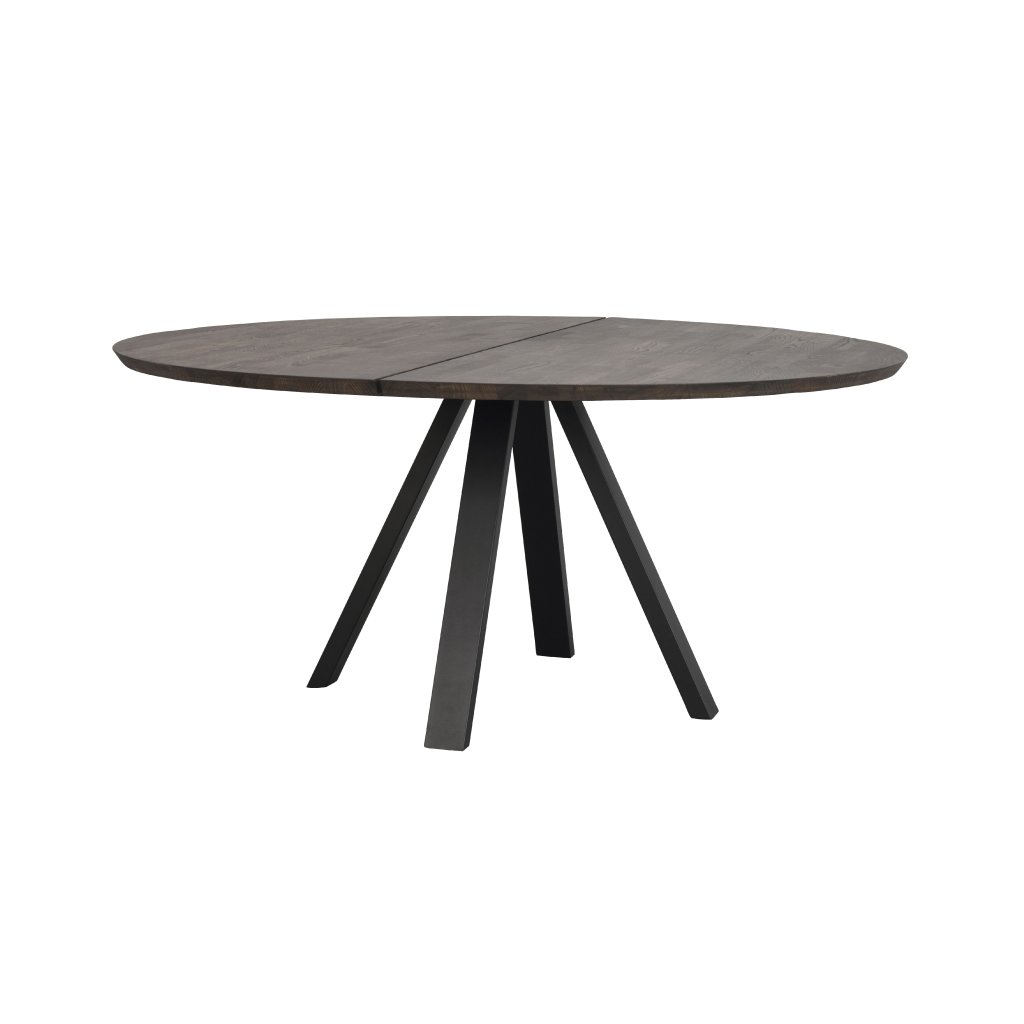 Kulatý jídelní stůl CARRADALE od švédského výrobce designového nábytku ROWICO. Stůl CARRADALE tvoří černě lakované kovové nohy, které zajišťují maximální stabilitu, nosnost a pevnost. Kulatá deska stolu je ze 2 částí masivního dubového dřeva v tmavě hnědé barvě. Deska má průměr 150 centimetrů. Stylový kulatý stůl udělá velkou parádu zejména v menších prostorech. Stůl má certifikát FSC, což značí ekologicky získané dřevo.