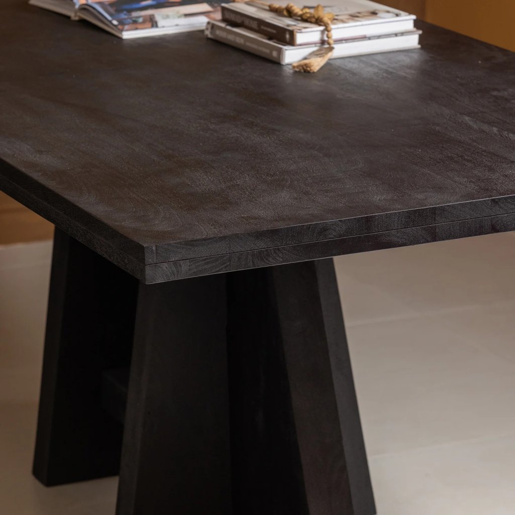 Designový jídelní stůl KEAN od holandského výrobce kvalitního nábytku WOOOD z kolekce Exclusive. Jídelní stůl KEAN s velkým prostorem nabízí dostatek místa pro 6 až 8 osob. KEAN je kompletně vyroben z mangového dřeva. Matný černý povrch s viditelnou kresbou viditelnou dodává jídelnímu stolu teplý vzhled. Hrubá noha dodává stolu, díky důmyslné technice spojení, stabilitu. Odvážný design je inspirovaný africkým uměním.