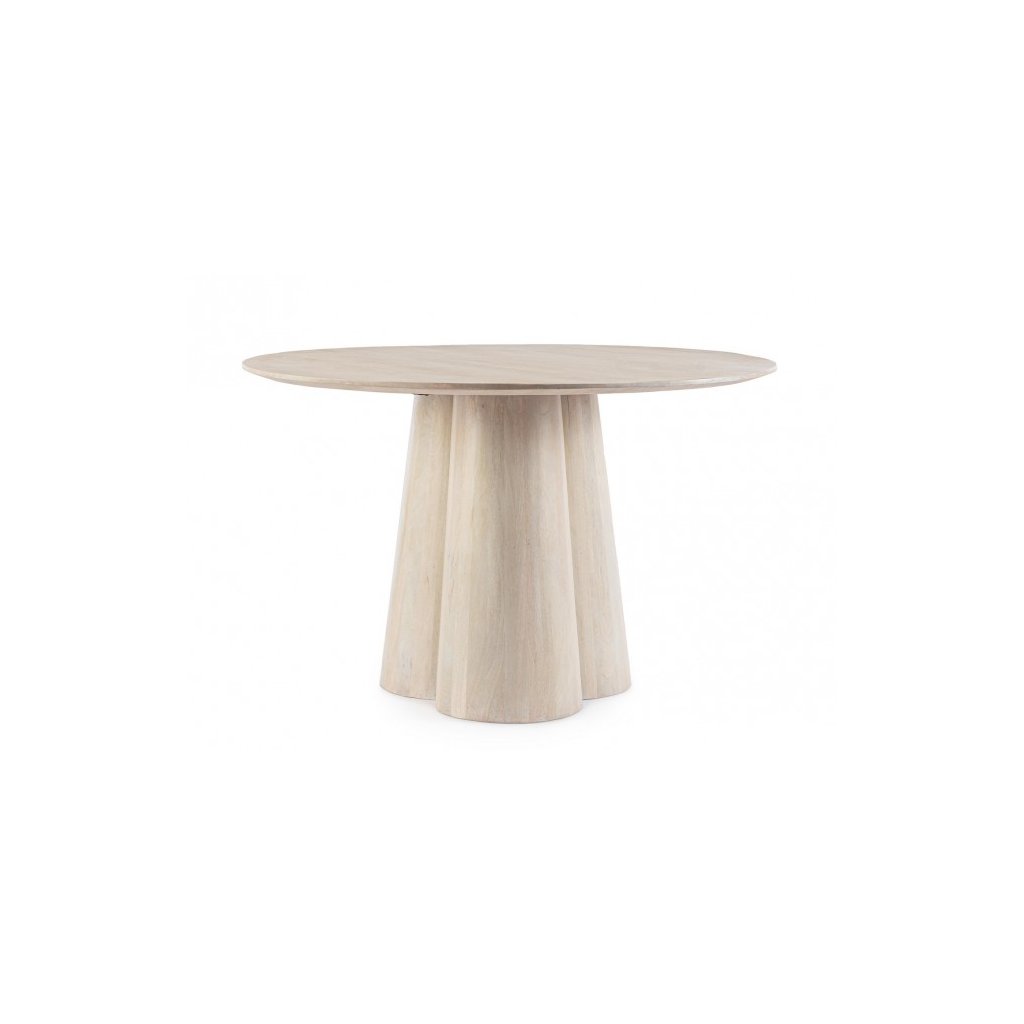 Designový kulatý jídelní stůl NASSOR od italského výrobce stylového nábytku BIZZOTTO. Stůl NASSOR s deskou o průměru 120 cm je kompletně vyroben z mangového dřeva ve světlé barvě.  Je to skutečný originál.  jednu robustní nohu, která je opticky rozdělena do tří částí, což děla stůl ještě více zajímavým.