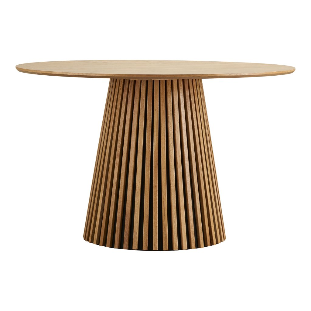Krásný jídelní stůl OSAKA od dánské značky nádherného skandinávského nábytku HOUSE NORDIC. Jídelní stůl spojuje přírodní vzhled s praktickým řešením pro každodenní i slavnostní stolování. Stolová deska o průměru ø120 cm je vyrobena z kvalitní MDF desky s dubovou dýhou v přírodním odstínu, který zvýrazňuje kresbu dřeva a dodává prostoru teplo a harmonii. Díky své výšce 75 cm a prostornému tvaru poskytuje pohodlné místo pro stolování až čtyř osob. Materiály nesou FSC certifikaci, což zaručuje šetrný přístup k přírodě.